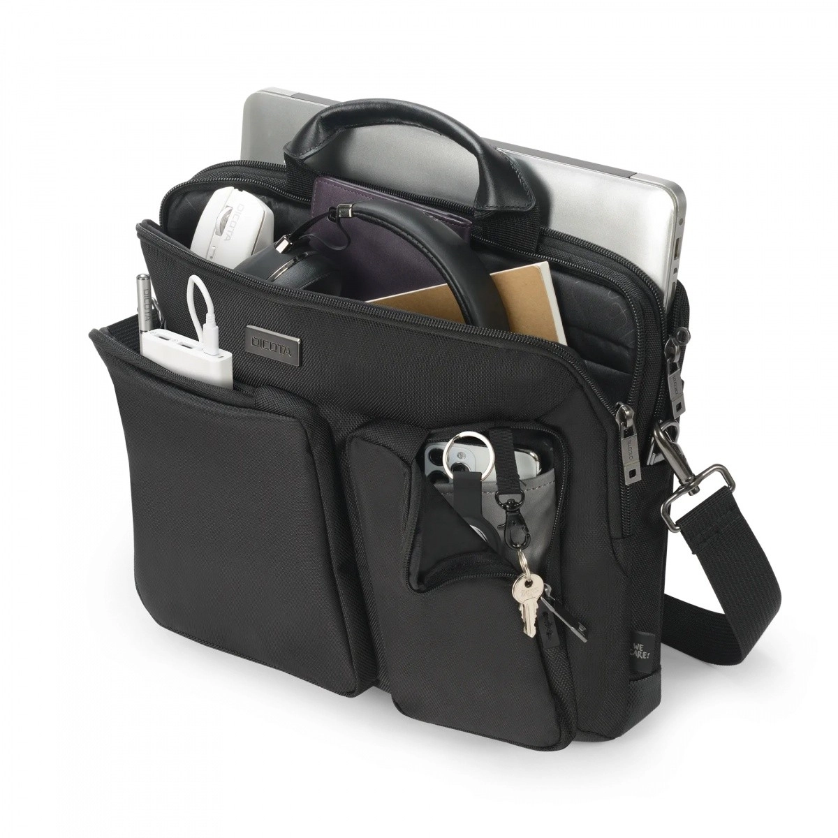 Frontlommer med organisator rummer mus, oplader, notesbog og småting – alt overskueligt på sin plads.
