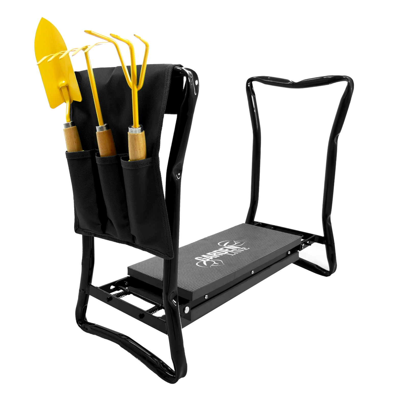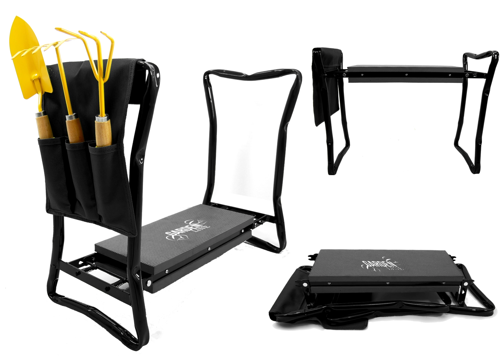 Den sidemonterede tekstillomme holder dine sakse, små river eller handsker lige ved hånden. Takket være de sammenklappelige ben kan produktet nemt opbevares i garage eller bil og tages med i haven, på picnic eller på fisketuren. Materialer af høj kvalitet (jern, EVA-skum, Oxford-stof) sikrer lang levetid og holdbarhed ved daglig brug.