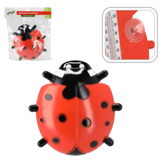 Stilfuldt udendørs termometer formet som en mariehøne i holdbar ABS + PVC, der giver præcis temperaturmåling og samtidig fungerer som et dekorativt element. Takket være fire gummisugekopper sidder det sikkert fast på vinduer eller fliser, de store, letlæselige tal gør hurtig aflæsning nem, og vejrbestandigheden sikrer lang levetid.