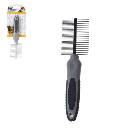 Praktisk dobbeltsidet kam til hunde og katte i størrelsen 19 × 5 cm er en fremragende hjælper til den daglige pelspleje. Takket være to typer tænder sikrer den effektiv udredning, nem fjernelse af filtre og fremmer et sundt, glansfuldt udseende. Det ergonomiske, gummibelagte håndtag giver komfortabelt og sikkert greb under kæmning.