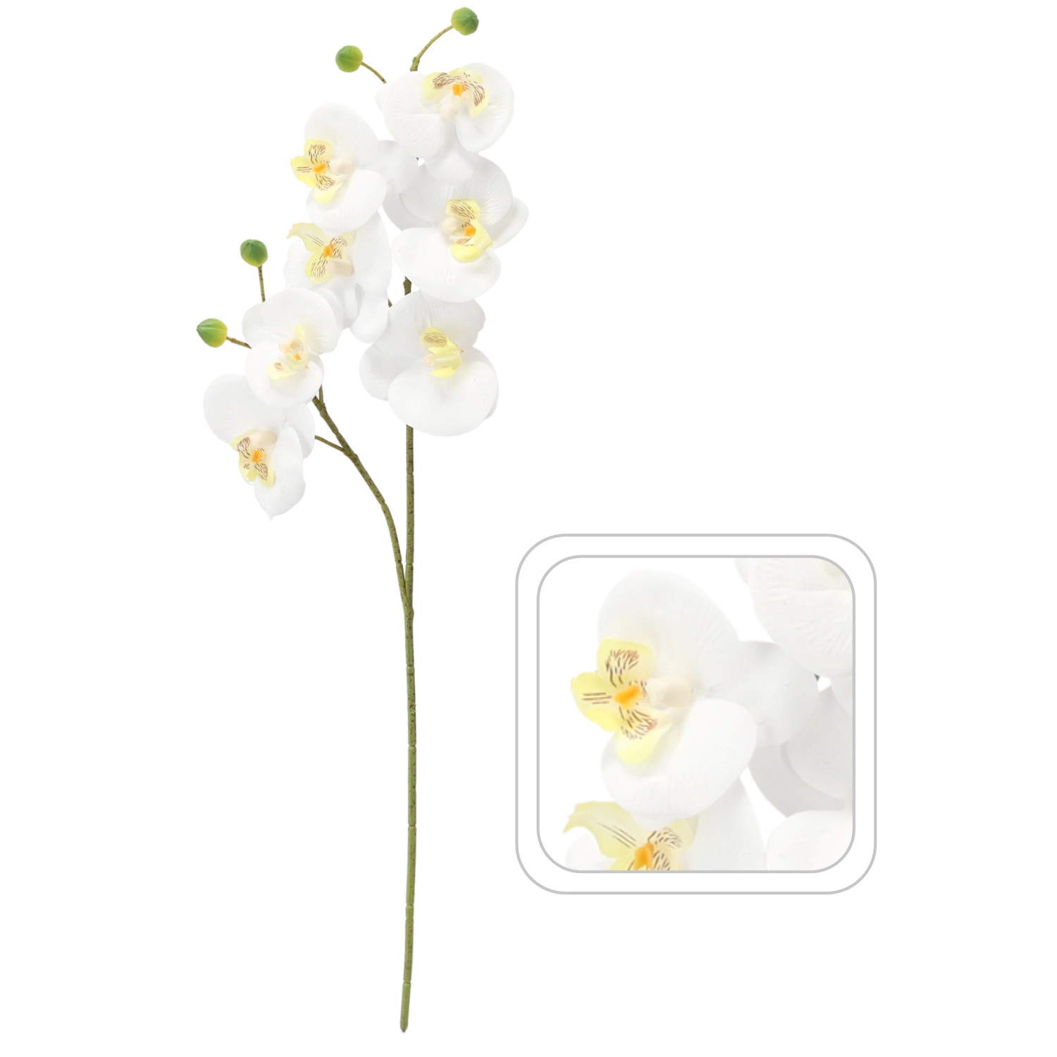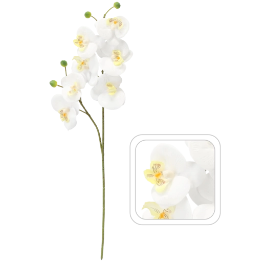 En elegant kunstig orkidégren på 64 cm i hvid, der giver dit interiør et sofistikeret udtryk og naturlig elegance uden krævende pleje. Takket være den realistiske udførelse og den fine blomsterstruktur virker den naturlig – ideel til vaser, blomsterarrangementer eller som en selvstændig dekoration på bordet. Det holdbare materiale sikrer en langvarig æstetisk effekt i hjemmet, på kontoret og ved særlige begivenheder.