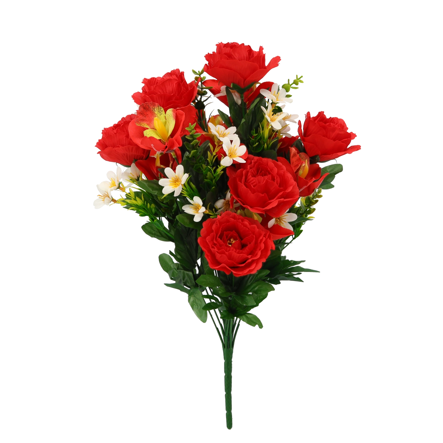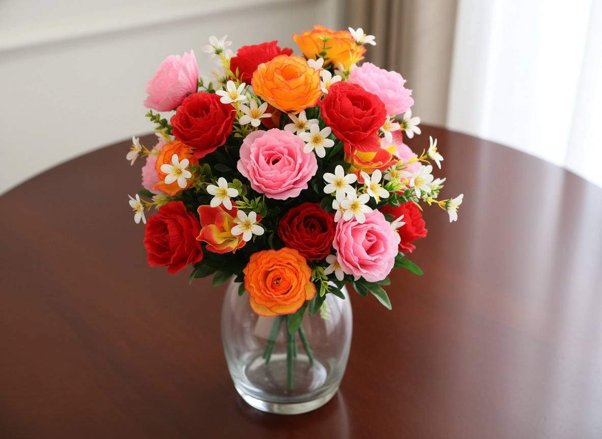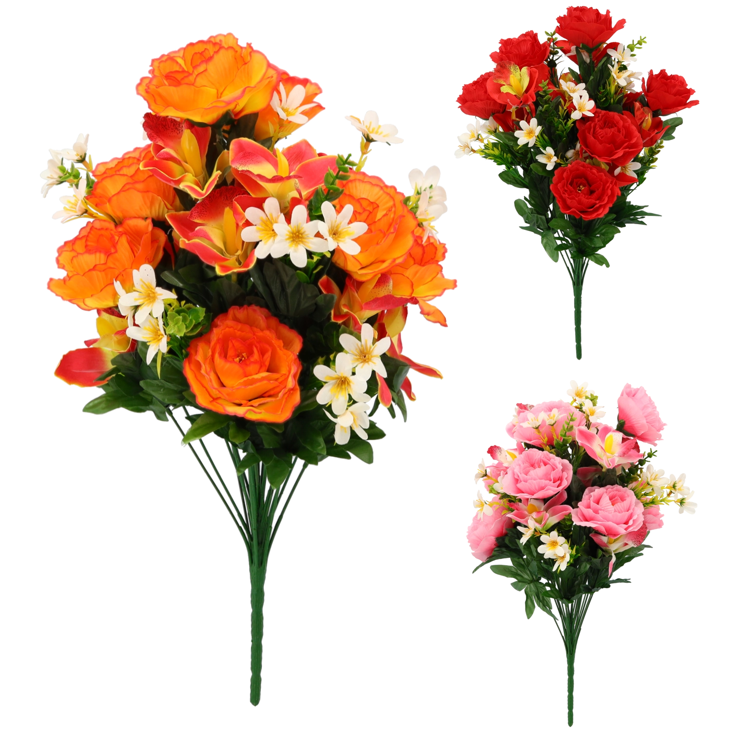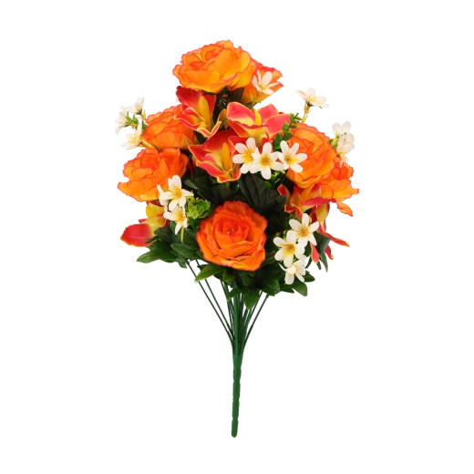Elegant kunstig buket med en kombination af roser, orkidéer og små hvide blomster i et farvemiks (rød, lyserød, orange). Den byder på realistiske detaljer, lang holdbarhed uden vedligeholdelse og lyser straks op i både interiør og festlig udsmykning.