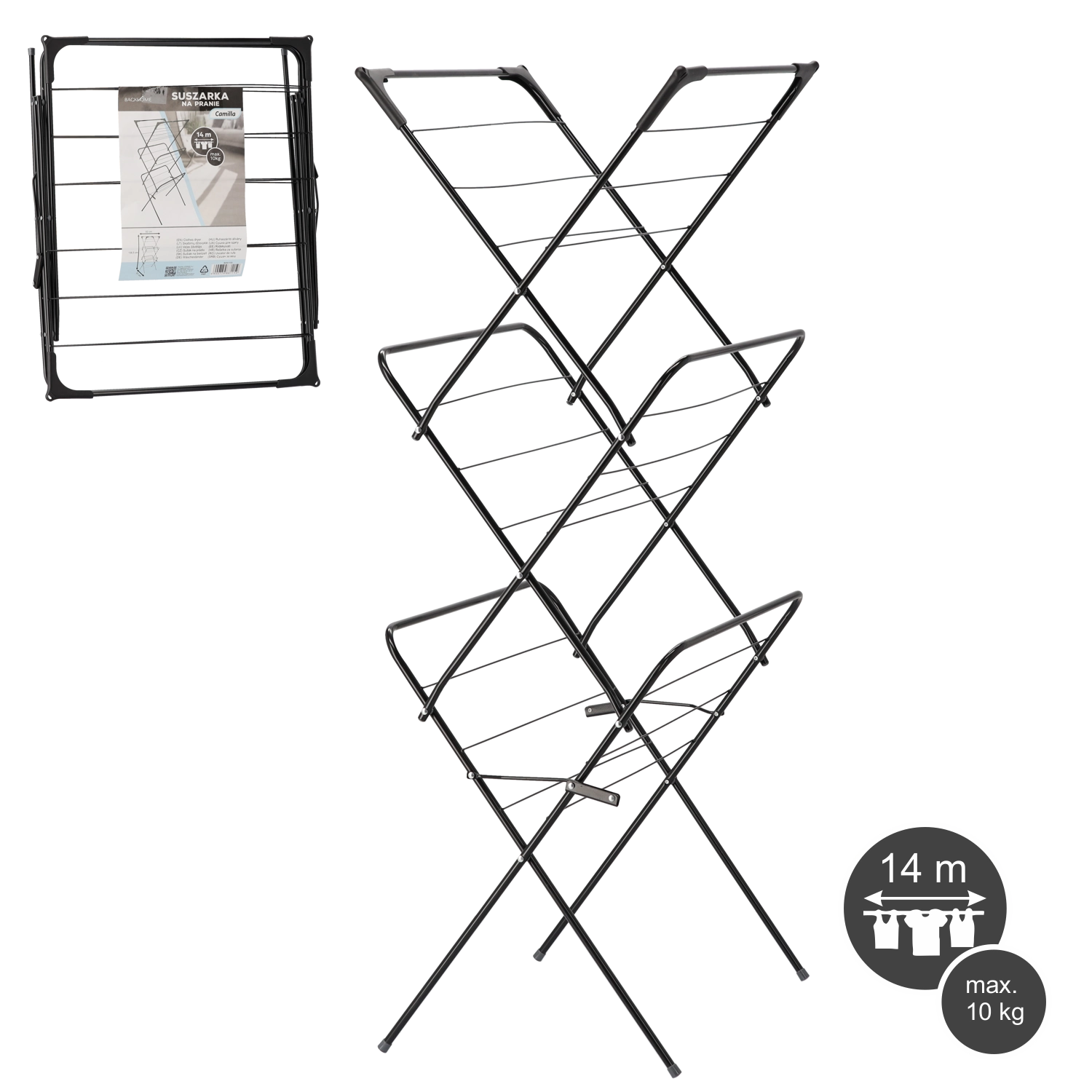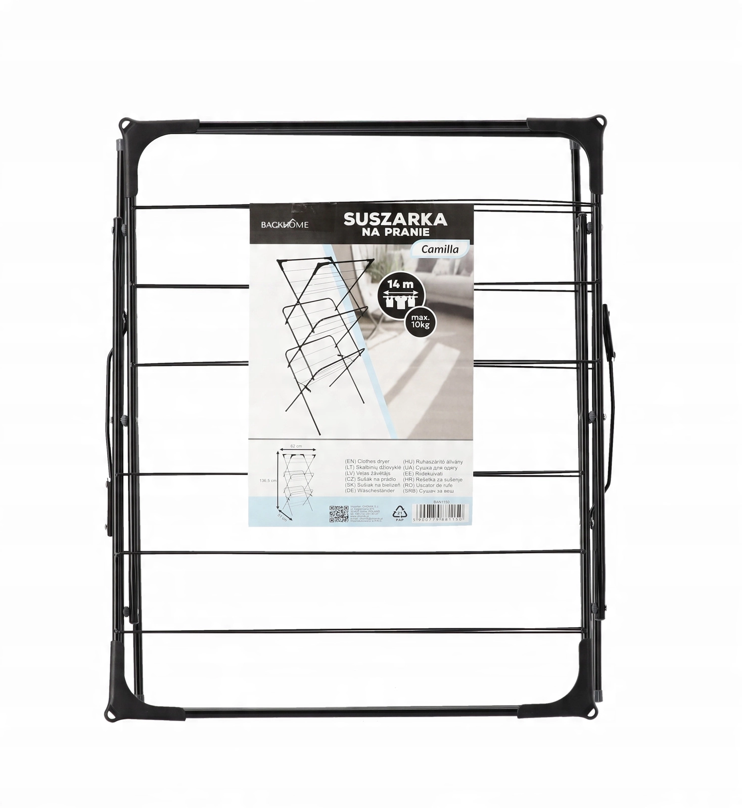 Tørrestativet Camilla i elegant sort kombinerer en holdbar metalkonstruktion med en praktisk flerniveaustyring af stængerne. Med i alt 14 meter tørreplads rummer det nemt en almindelig vask og sparer samtidig plads i hjemmet.