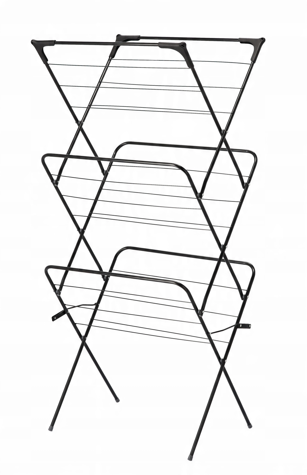 Den solide metalramme i sort tåler daglig brug og vejrpåvirkninger og sikrer stabilitet ved tørring både hjemme og på altanen.
