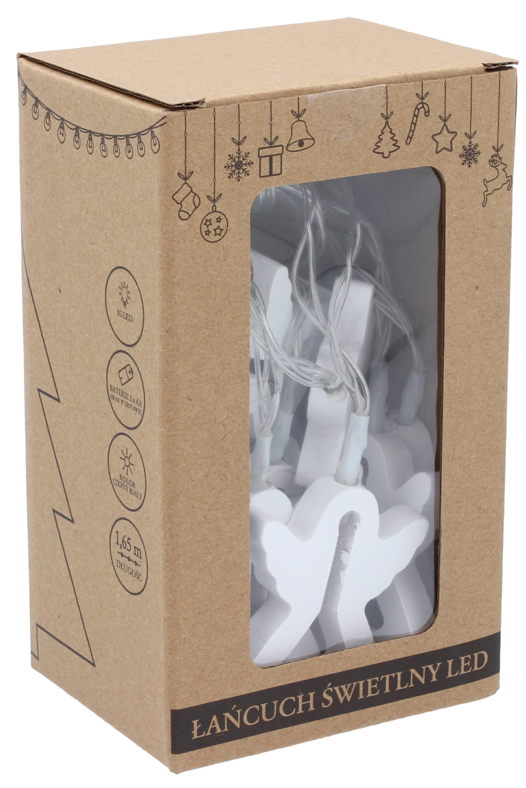 Skab en magisk stemning i dit hjem med denne dekorative LED-lyskæde med motiv af træengle. Den byder på varmt hvidt lys, AA-batteridrift for nem placering uden stikkontakt og 10 LED-dioder med tæt afstand for jævn belysning. Ideel til aftener, højtider og som helårsdekoration.