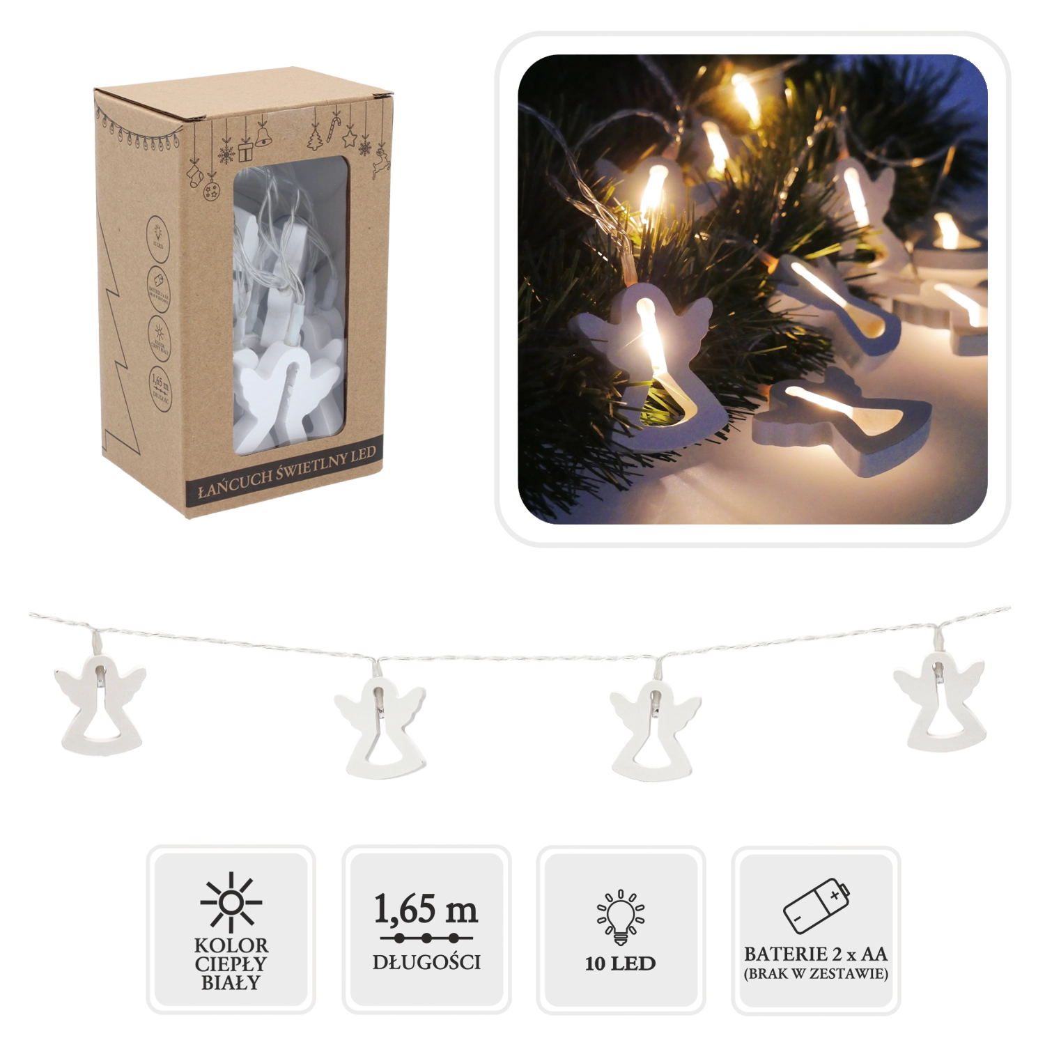 Den elegante LED-lyskæde med træengle skaber en hyggelig og festlig atmosfære i ethvert interiør. Takket være det varmt hvide lys fremhæves træets naturlige struktur, og dekorationen virker behagelig og harmonisk. Drift med 2× AA-batterier giver dig mulighed for at placere lyskæden hvor som helst uden bekymringer om kabler.