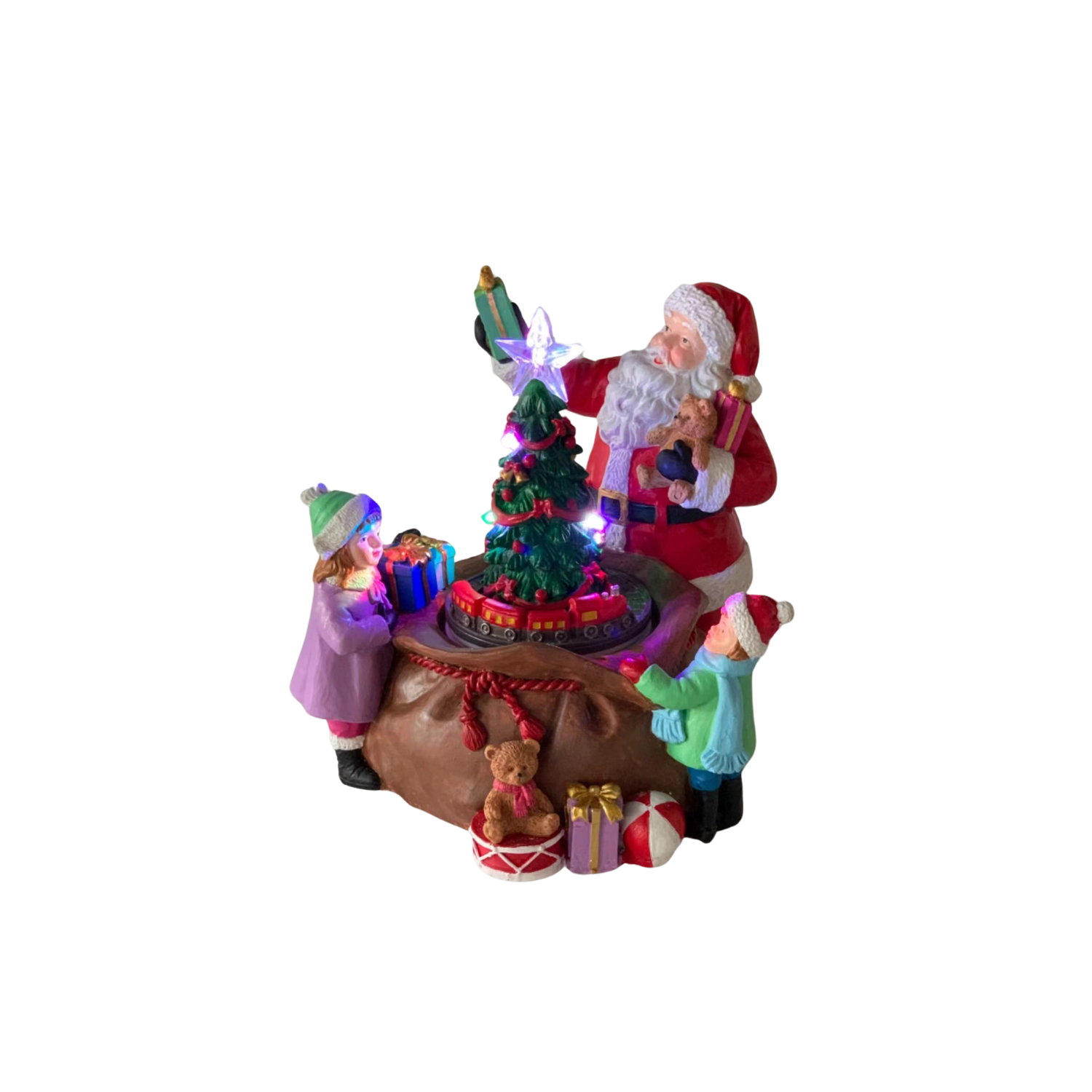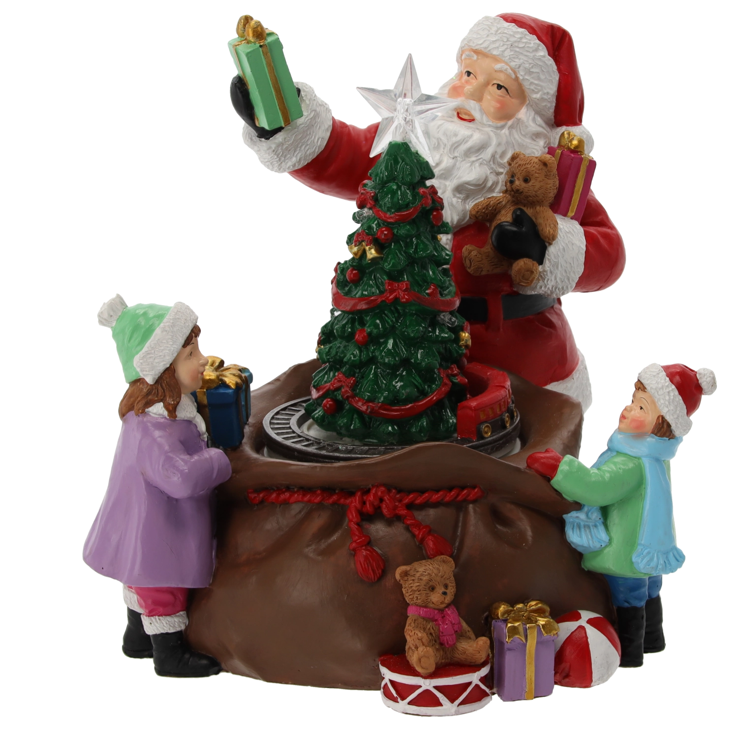 Denne detaljerede juledekoration med figur af JULEMANDEN, børn og gavmild gaveuddeling omkring det oplyste træ forvandler enhver indretning til et hyggeligt, festligt hjørne. Integrerede LED-dioder inklusive en strålende stjerne i toppen af træet og farvede lys skaber en varm, højtidelig stemning.