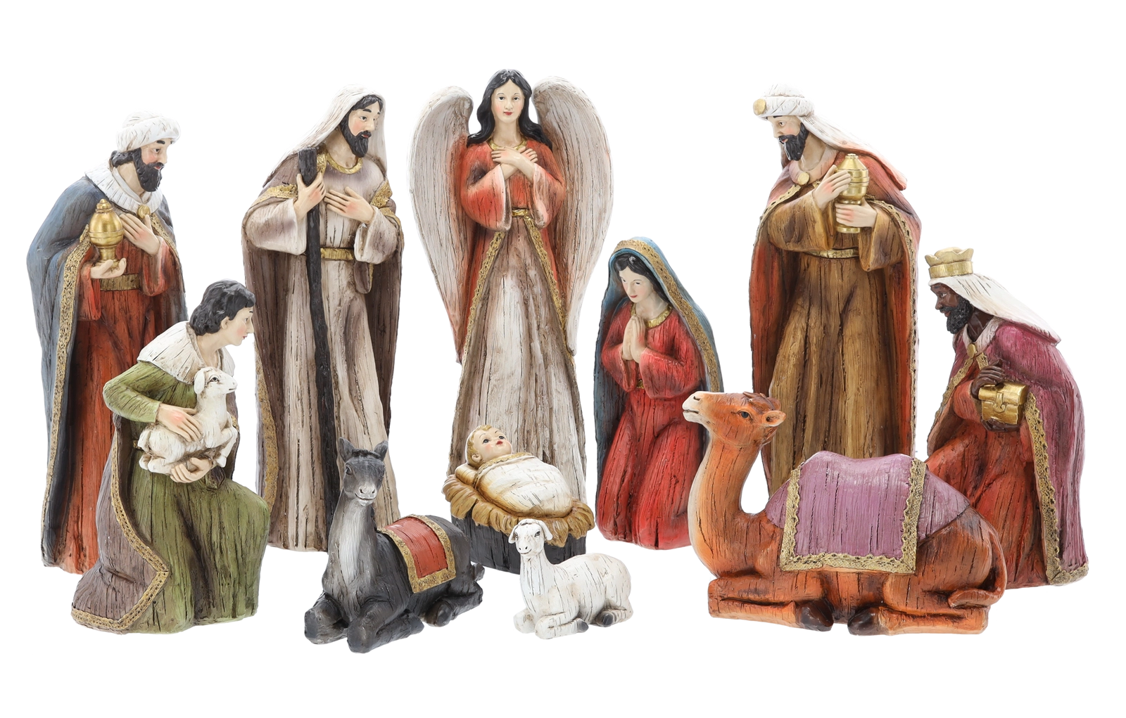 - Jesusbarnet, Maria, Josef, De tre vise mænd, engel, hyrde, får, æsel, kamel