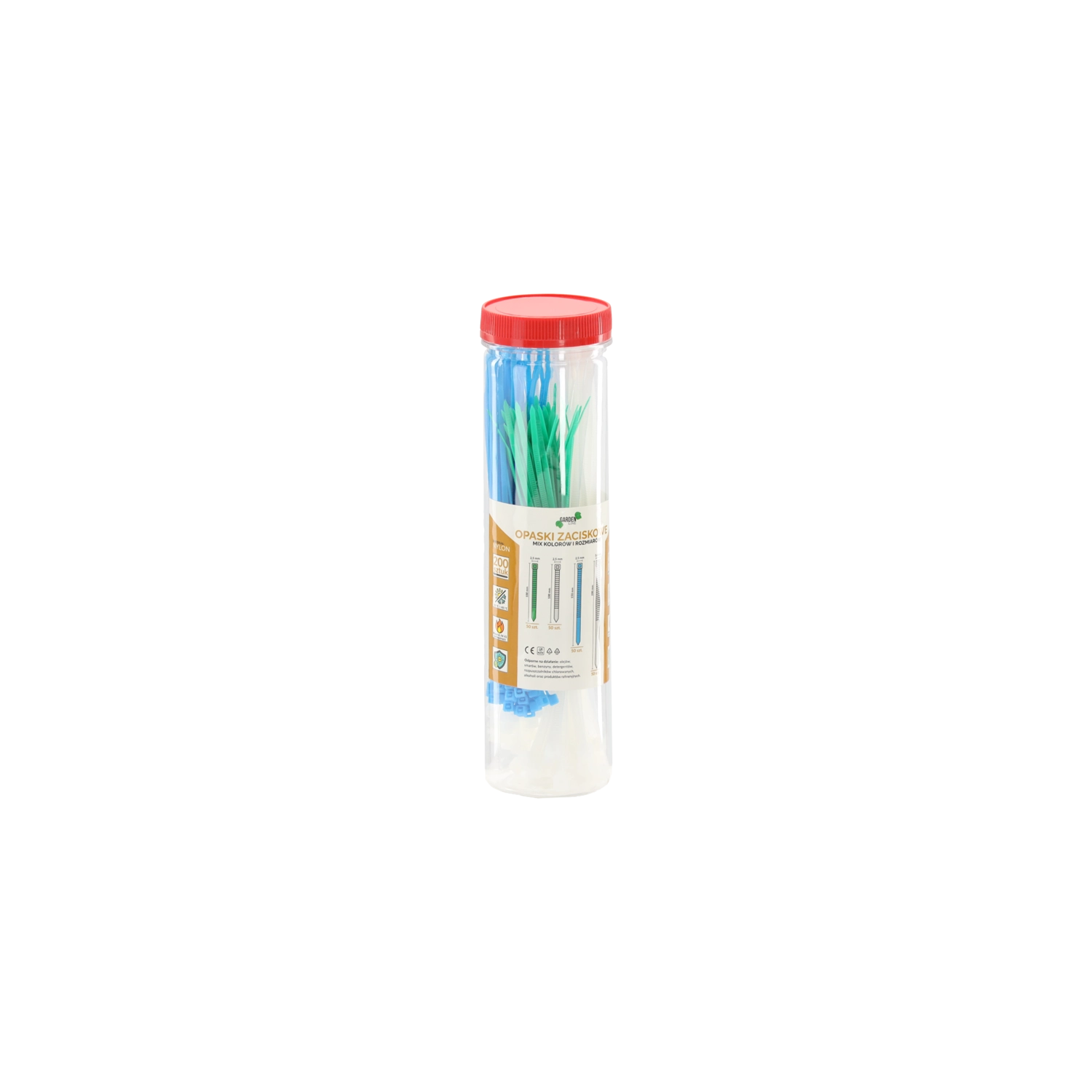 - 50 stk 2,5 × 100 mm – grønne; 50 stk 2,5 × 100 mm – hvide; 50 stk 2,5 × 150 mm – blå; 50 stk 3,6 × 200 mm – hvide