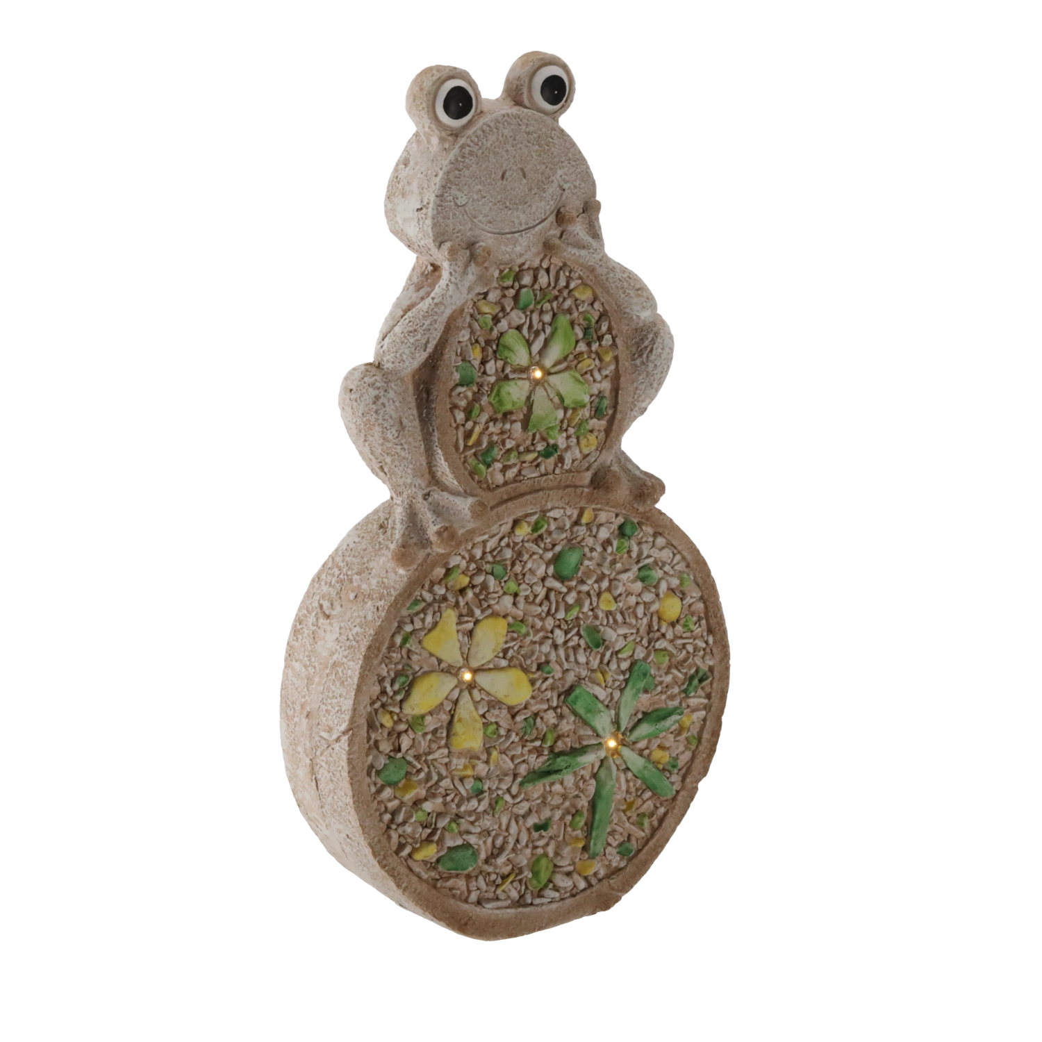 Overfladen med stenstruktur og farvede mosaikindlæg giver frøfiguren et autentisk udtryk, der fanger blikket med det samme.