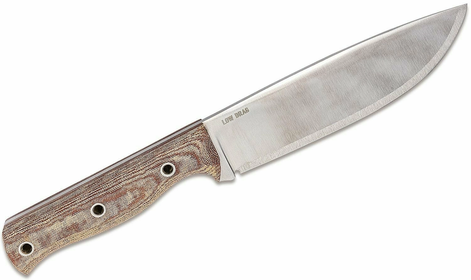 Håndtaget i brun Micarta med markant tekstur og ergonomisk form ligger sikkert i hånden i både tørt og vådt vejr. Ståltypen 1075 er sejt kulstofstål – for lang levetid er det nok at rense bladet efter brug og lette det med olie ind imellem.