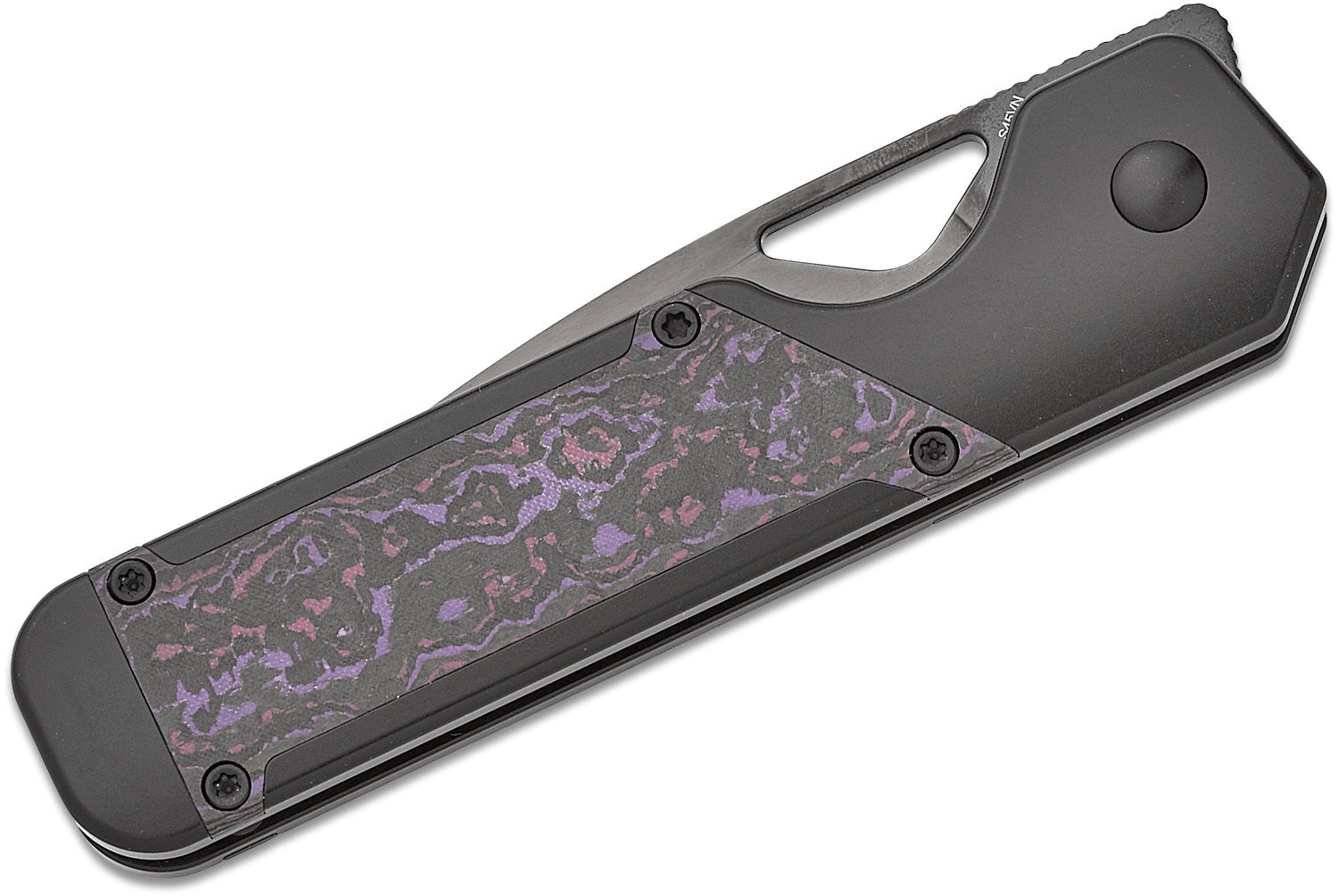 Let og stærkt titaniumskaft med dekorativ Fatcarbon Purple Haze-indlæg og dybbæret lommeklip for komfortabel bæring.