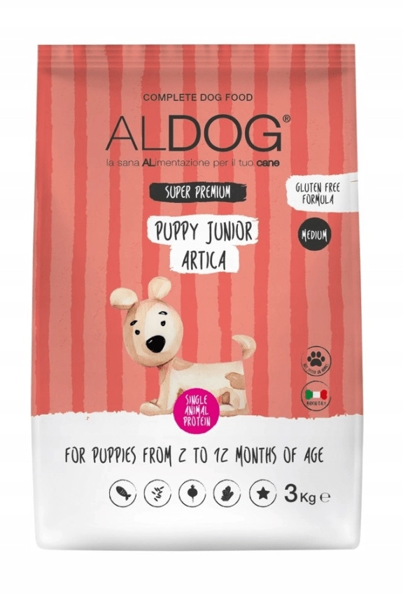 Aldog Puppy-Junior Artica Medium er et afbalanceret superpremiumfoder til hvalpe af mellemstore racer i den intensive vækstfase. Opskriften med et højt indhold af laksemel (40 %) og laksolie leverer kvalitetsproteiner og essentielle fedtsyrer til korrekt udvikling af muskler, immunitet samt hud og pels. Takket være den eneste animalske proteinkilde er foderet velegnet til mere følsomme hunde.