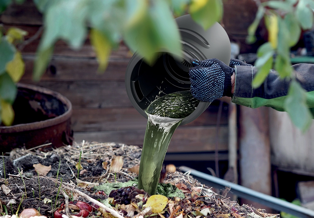 Den færdige flydende gødning tappes direkte i vandkanden. Hanen sikrer kontrolleret gennemstrømning og ren vanding uden spild.