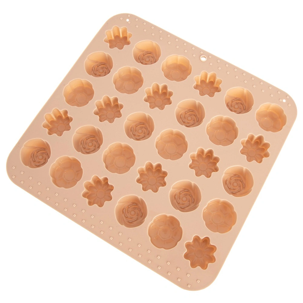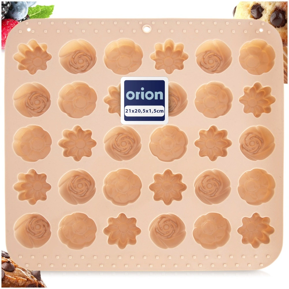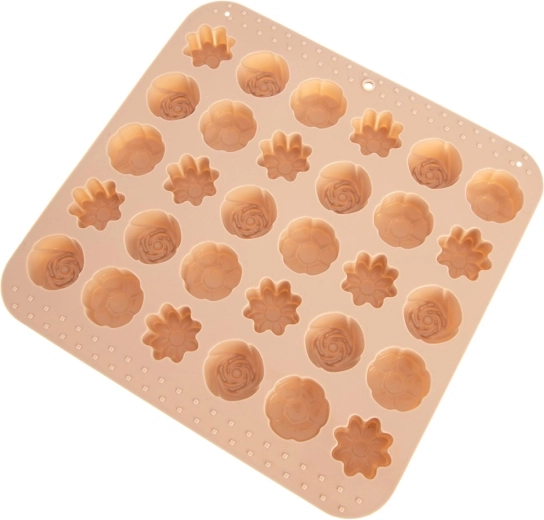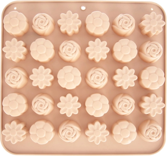 Denne alsidige silikoneform i beige gør det nemt at fremstille hjemmelavede praliner, chokolader og små småkager. Den tilbyder 3 forskellige blomsterdesigns og i alt 30 fordybninger, så du nemt kan lave imponerende serveringer og spiselige gaver. Takket være det fleksible og non-stick materiale slipper de færdige stykker let uden behov for at smøre.