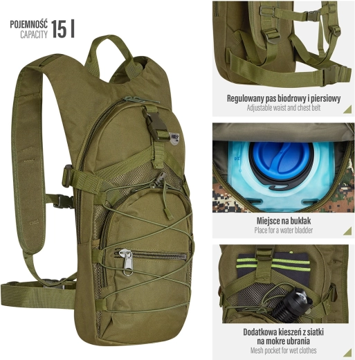 Kompakt og slidstærk rygsæk på 15 l til endagsture, by og cykling. Tilbyder forberedelse til drikkeblære, organiserede lommer, bryst- og hofterem og let materiale, der er modstandsdygtigt over for slid og stænk.