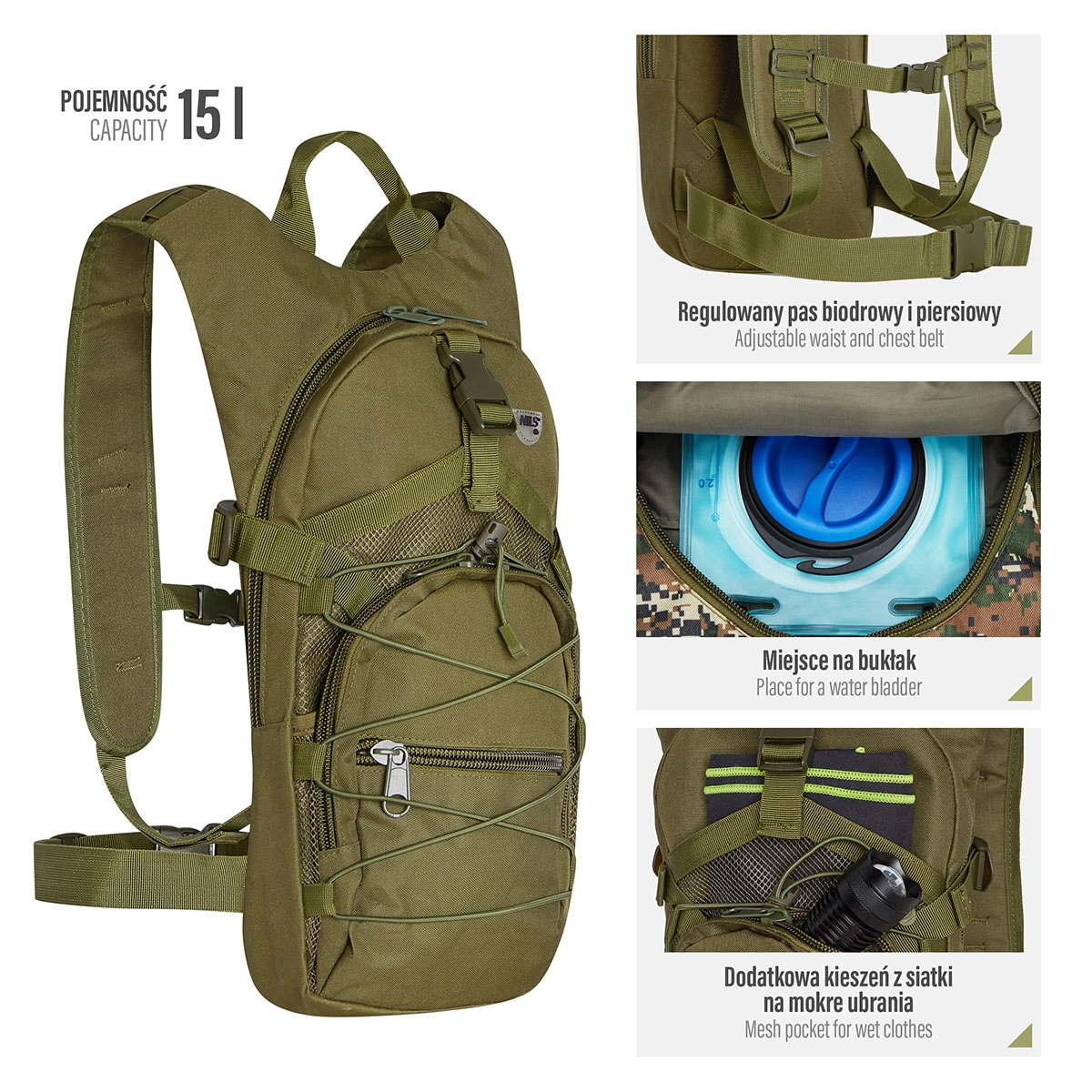 • Komfort på farten: justerbare stropper, elastisk holder til drikkeslange, robust bærehåndtag