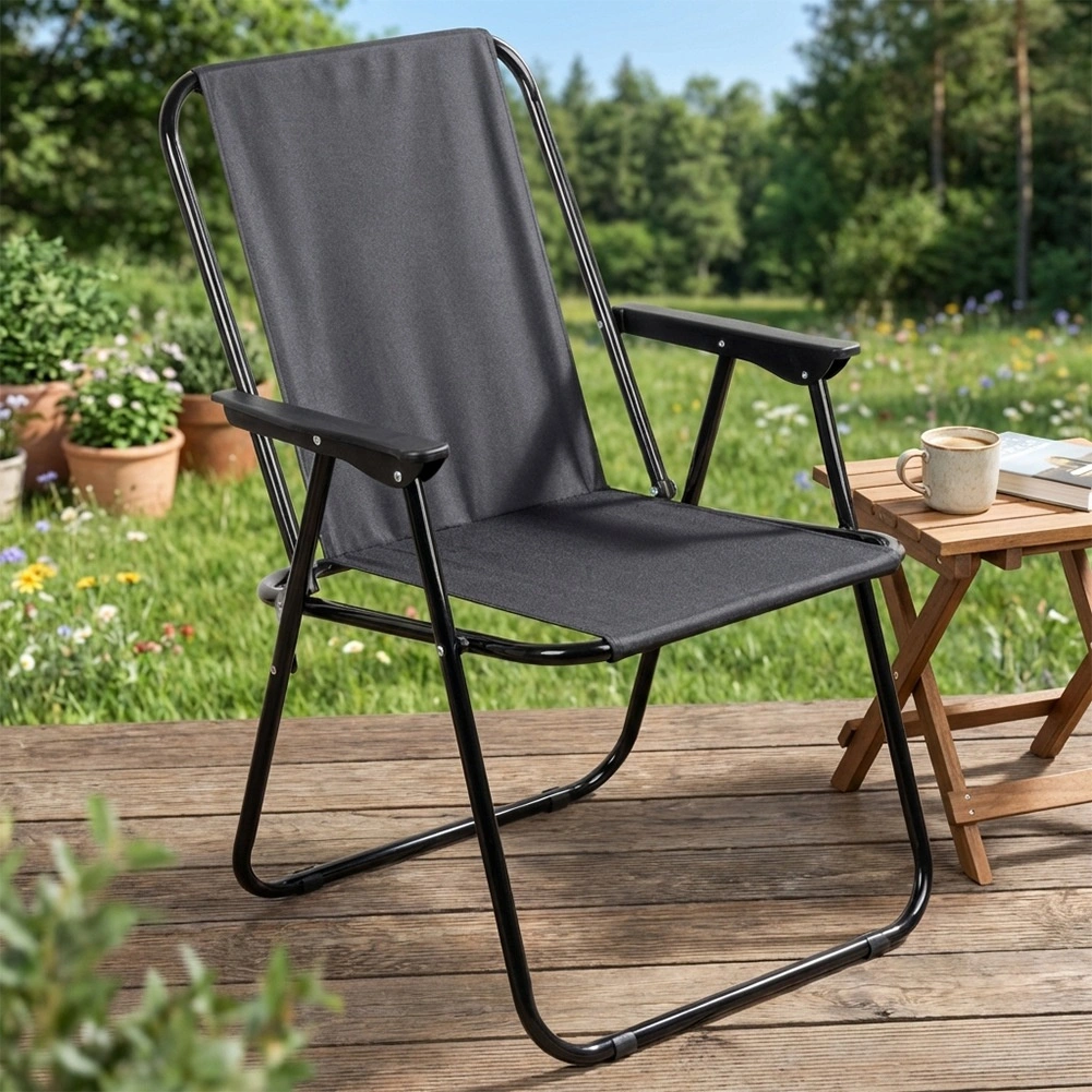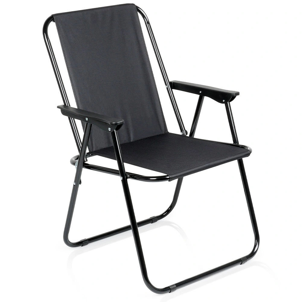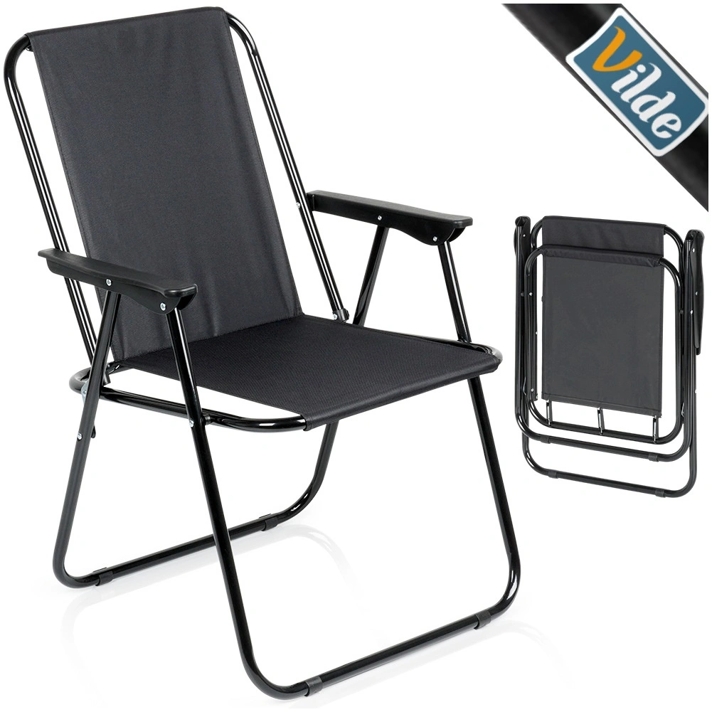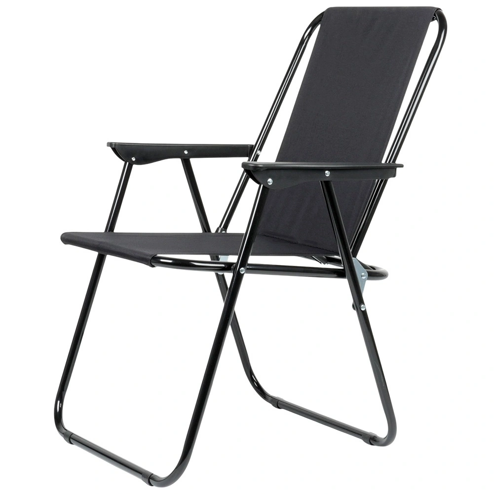Praktisk sammenklappelig turiststol i sort, der tilbyder let vægt, robust metalkonstruktion og behagelige armlæn. Takket være de kompakte mål efter sammenklapning er den nem at transportere og opbevare. Ideel til camping, fiskeri, have, balkon og strand, med en bæreevne på op til 120 kg.