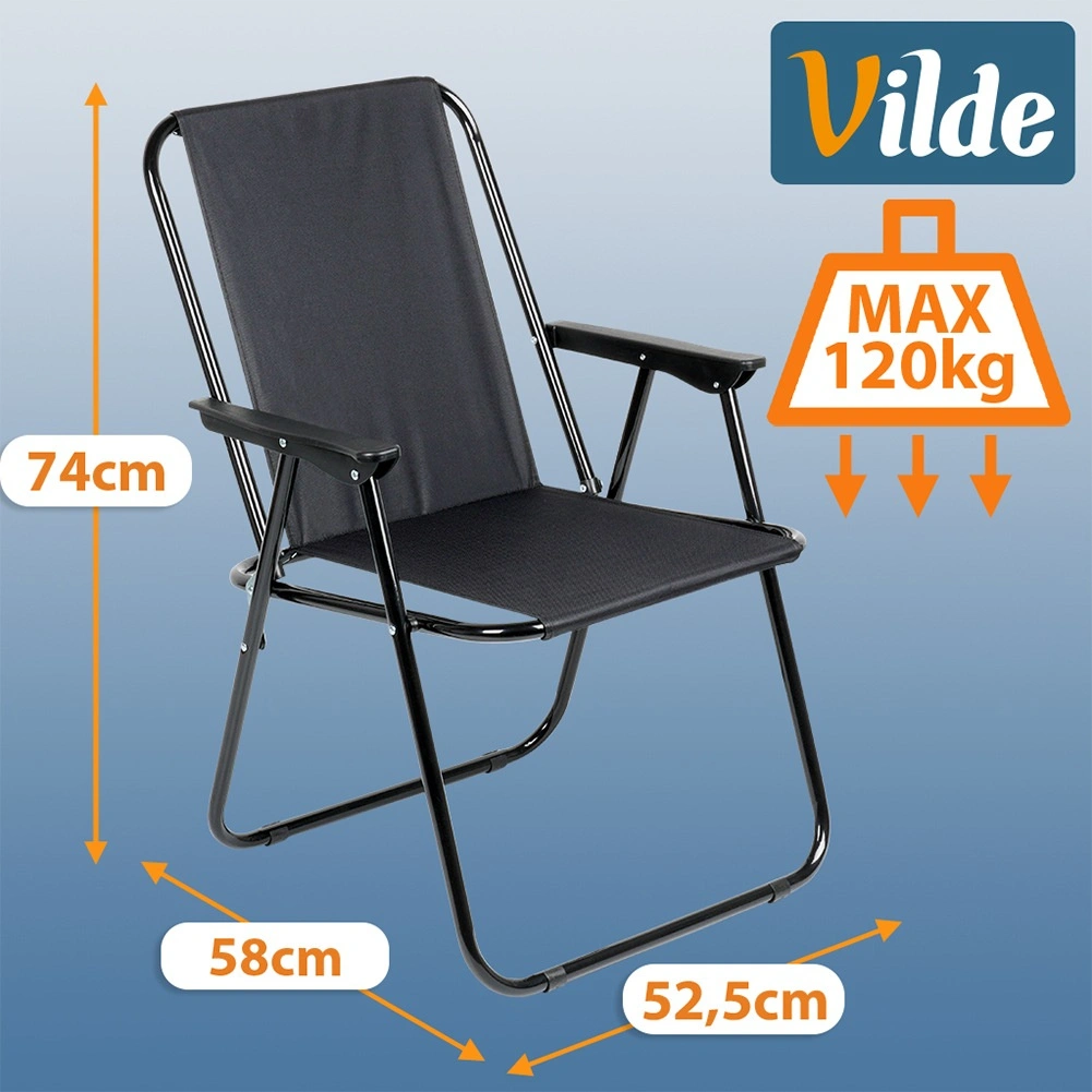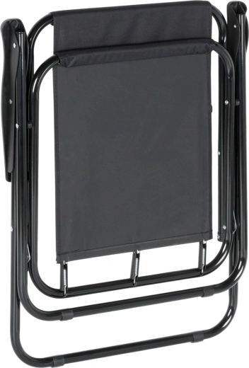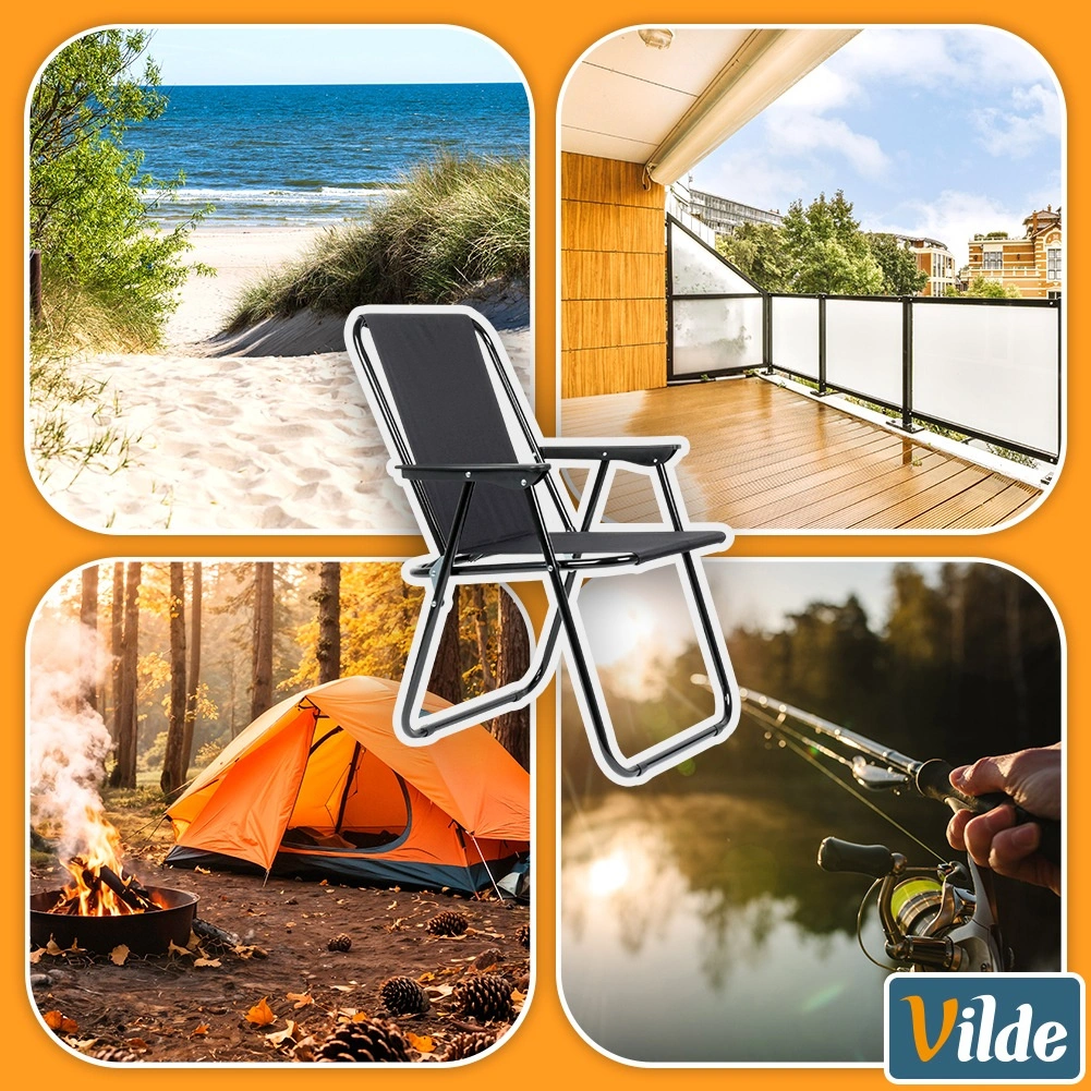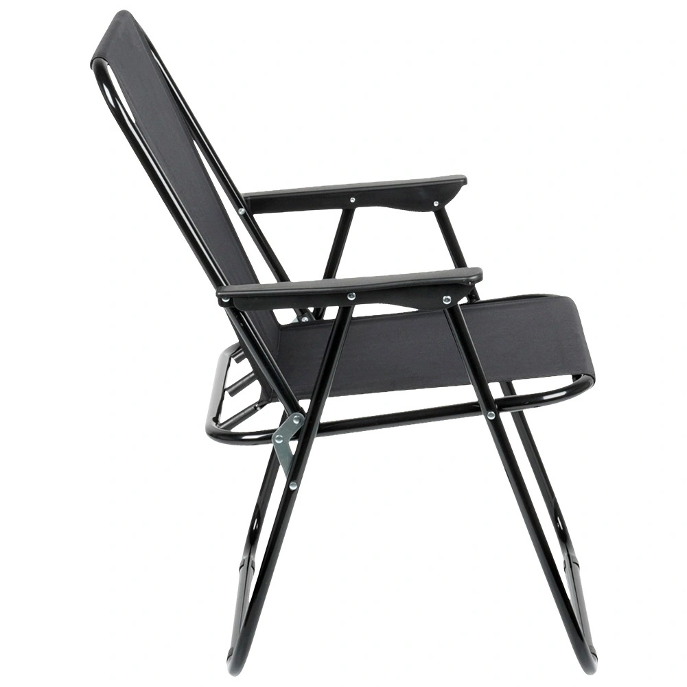 Praktisk sammenklappelig turiststol i sort, der tilbyder let vægt, robust metalkonstruktion og behagelige armlæn. Takket være de kompakte mål efter sammenklapning er den nem at transportere og opbevare. Ideel til camping, fiskeri, have, balkon og strand, med en bæreevne på op til 120 kg.