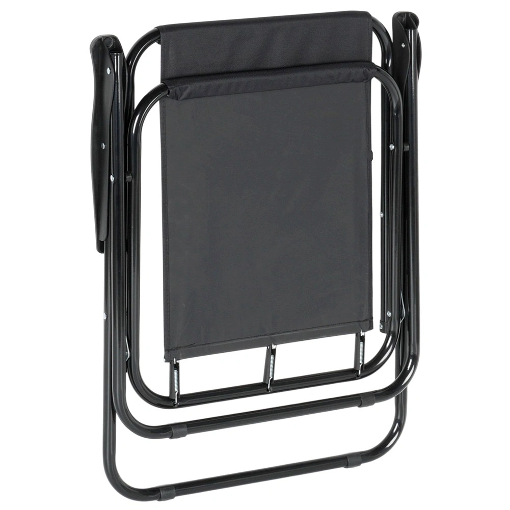 Denne sammenklappelige campingstol er en pålidelig ledsager til enhver udendørsoplevelse. Det slidstærke polstrede polyester i sort og den robuste metalramme sikrer lang levetid og stabilitet. Takket være armlænene er siddekomforten høj – også under længere pauser.