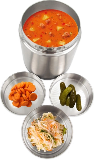 Når skålene er taget ud, kan beholderen bruges som en rummelig madboks til supper, risotto eller saucer. Den brede åbning gør påfyldning og rengøring let, og det kvalitetsrige rustfri stål sikrer lang levetid. Perfekt til daglig brug på arbejde, under rejser, til sport og for dem, der ikke spiser på restaurant. Termobeholderen er også velegnet til kolde desserter, for eksempel is.