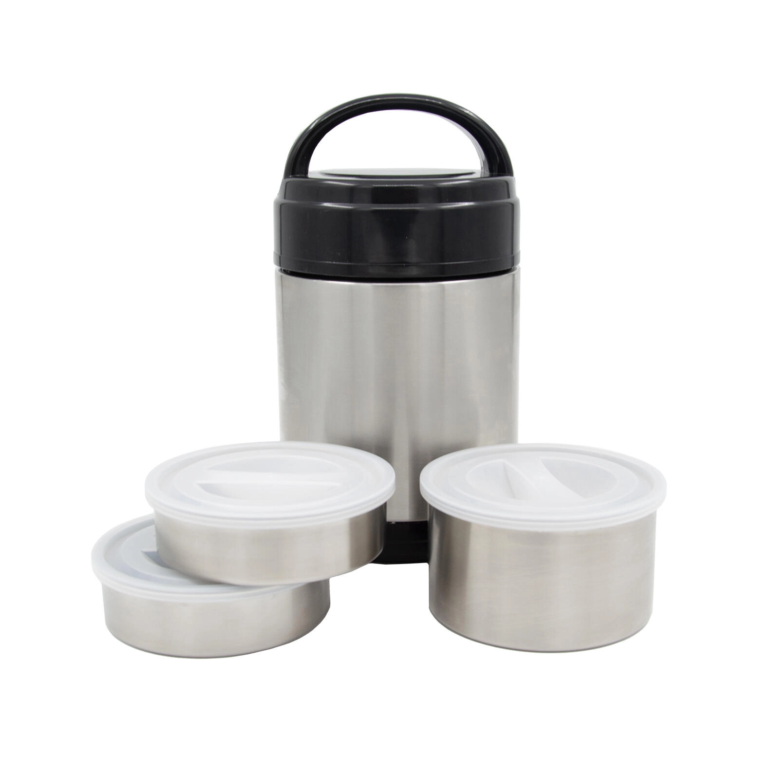 Madtermoflasken med en diameter på 11 cm kombinerer robust rustfrit stål med praktiske plastdetaljer. Indeni finder du tre separate skåle – to på 0,25 l og én på 0,5 l – hver med et tætsluttende plastlåg. Det gør det muligt sikkert at adskille de forskellige retter, bevare friskheden og servere bekvemt. Den ydre plastbund reducerer støj ved nedsætning, og det solide håndtag gør transporten lettere.