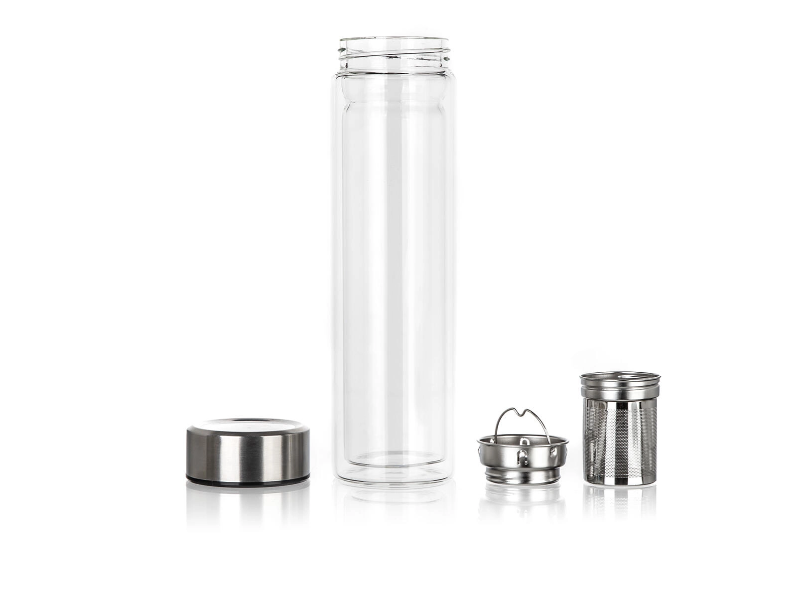 Medfølger er en aftagelig fin si i rustfrit stål, der gør det nemt at trække løste eller tilberede infusioner med urter og frugt direkte i flasken. Låg i rustfrit stål 18/8 sikrer hygiejne, holdbarhed og en sikker lukning. Det rene, moderne design i klart glas fremhæver desuden drikkens farve.