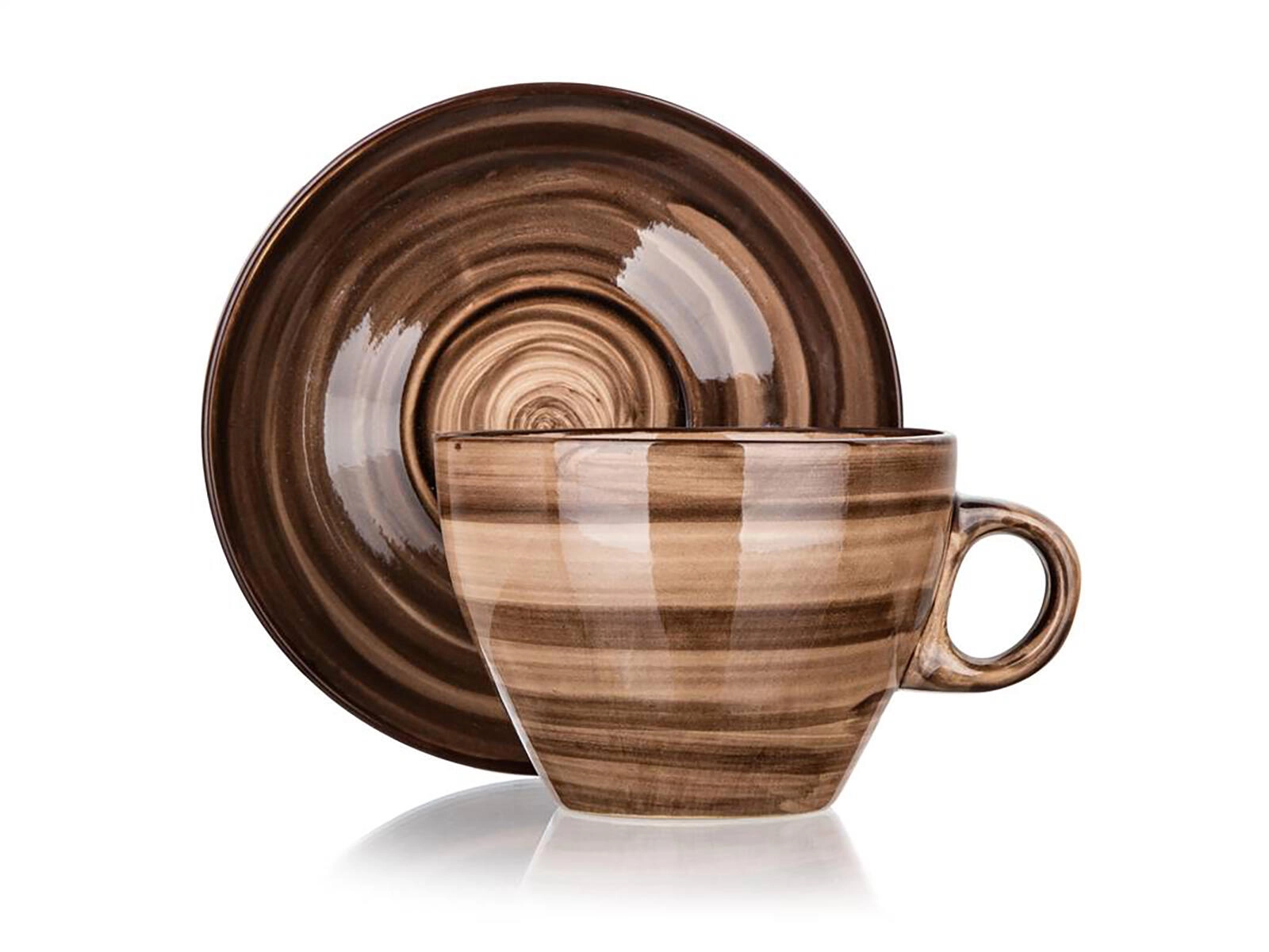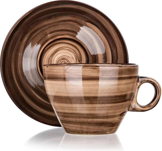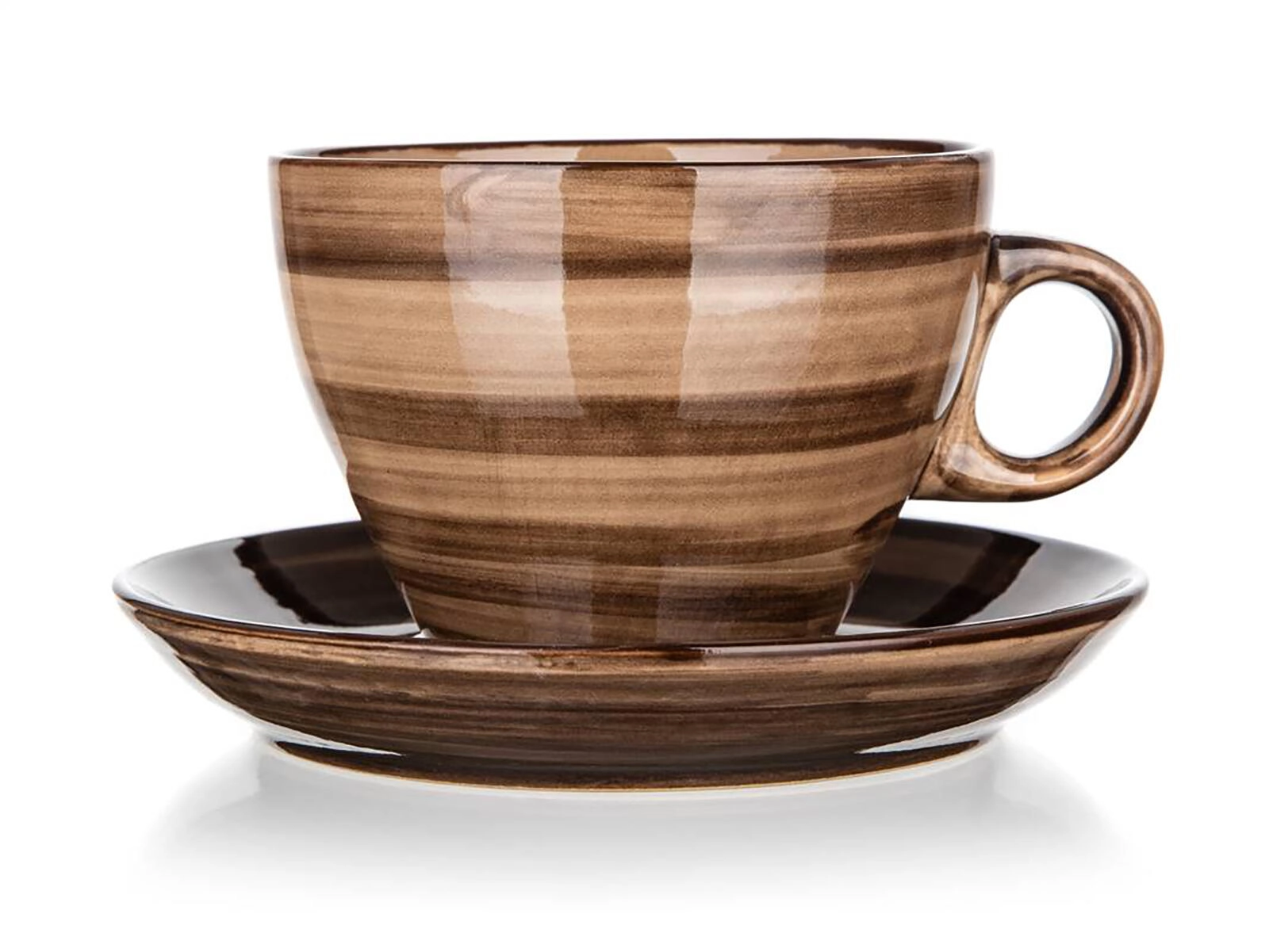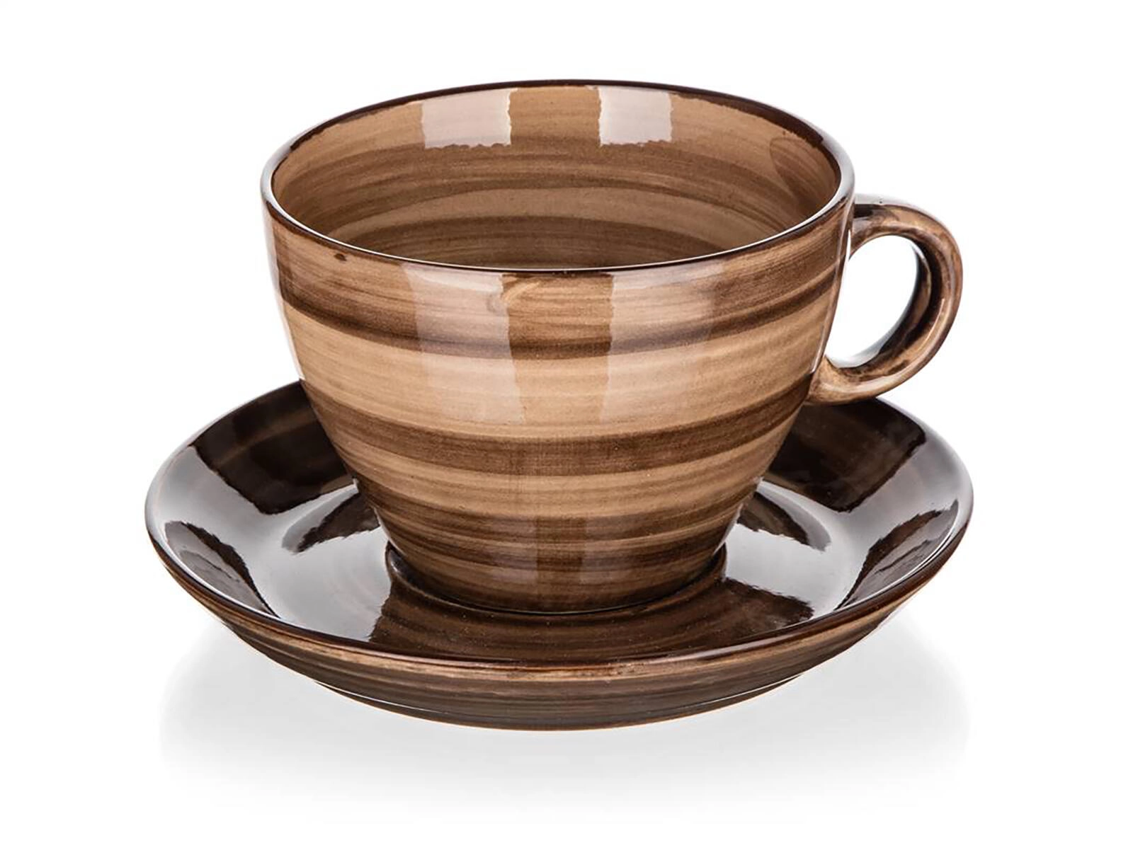 Blank, flerfarvet brun glasur med diskrete striber giver både kop og underkop et tidløst udseende og er let at kombinere med andet service.