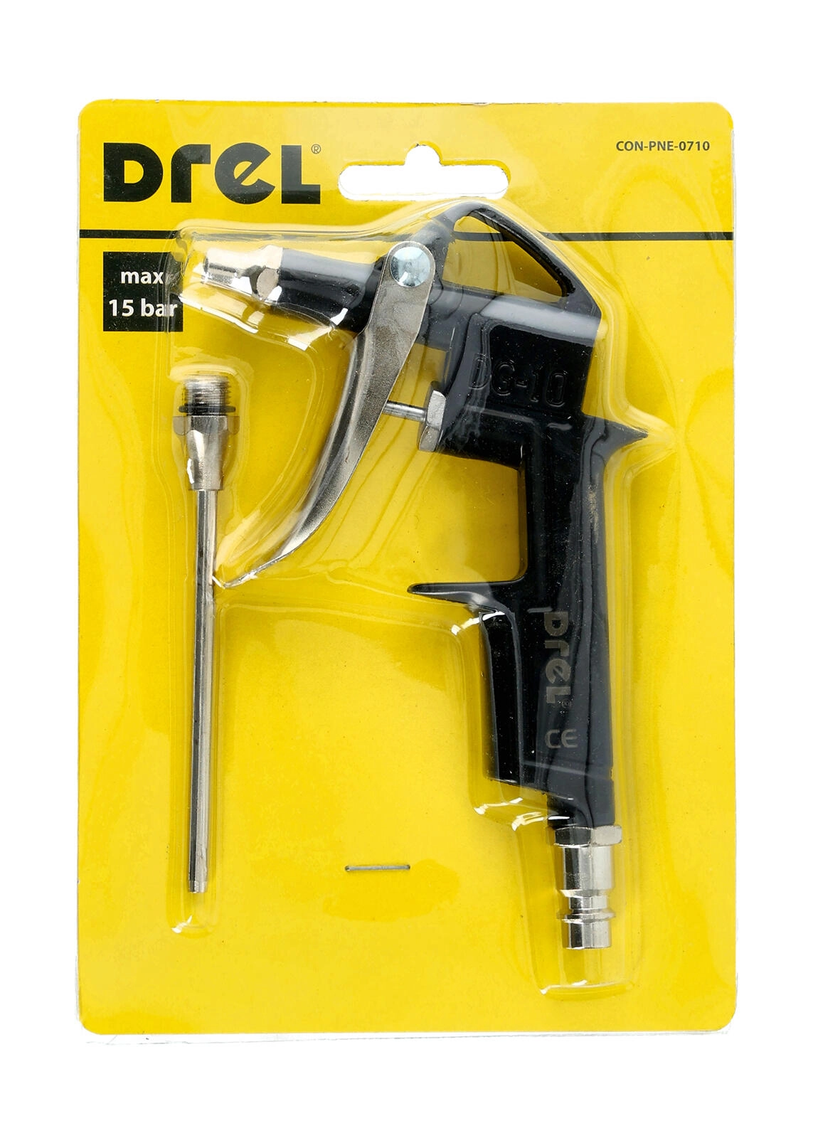 Praktisk Drel blæsepistol til hurtig rengøring og udblæsning af dele med trykluft. Tilbyder maksimalt tryk 15 bar, hus i aluminiumsmetal for lang levetid og præcis dyse 2 mm med lang forlænger 93 mm for bedre rækkevidde.