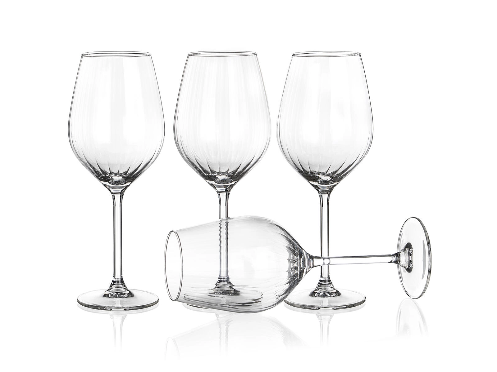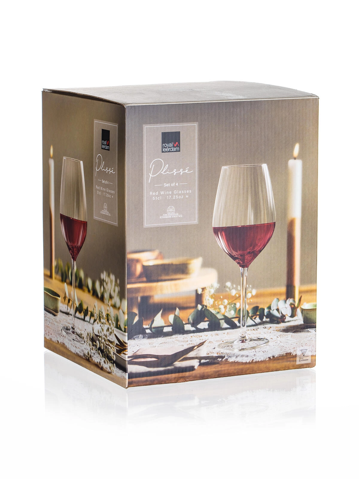 Elegant sæt med fire vinglas fra kollektionen Plissé fra ROYAL LEERDAM tilbyder en ideel kapacitet på 510 ml, slankt og holdbart design med hærdet kant og en perfekt form til aerering af rødvin.