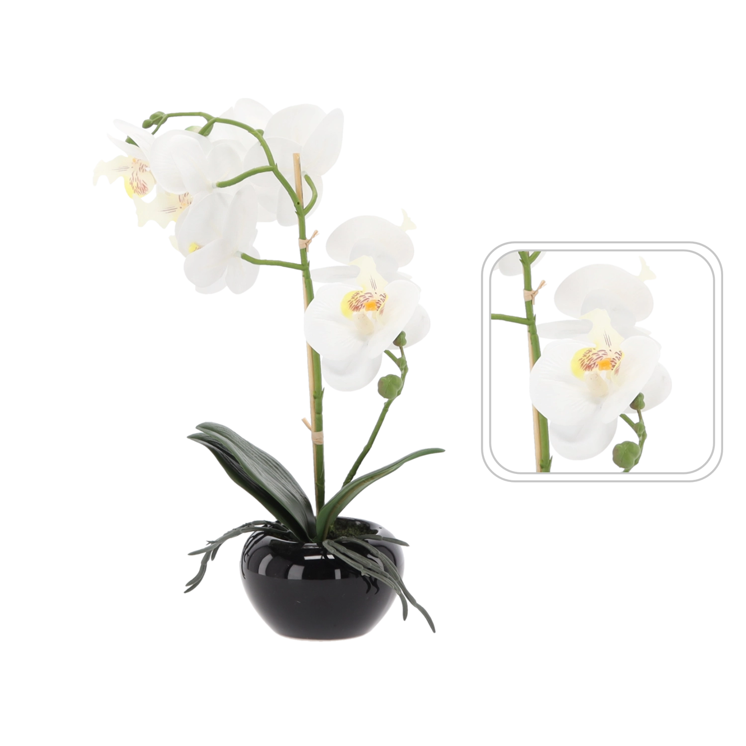 Denne kunstige hvide orkidé udmærker sig ved realistiske detaljer og en kompakt højde på 30 cm, hvilket gør den nem at placere på mindre overflader. Den er et fremragende valg for dem, der ønsker at give deres rum et frisk udtryk uden behov for regelmæssig vanding eller særlige forhold.