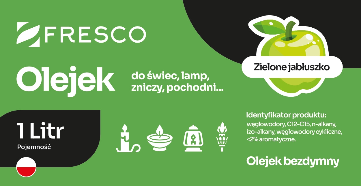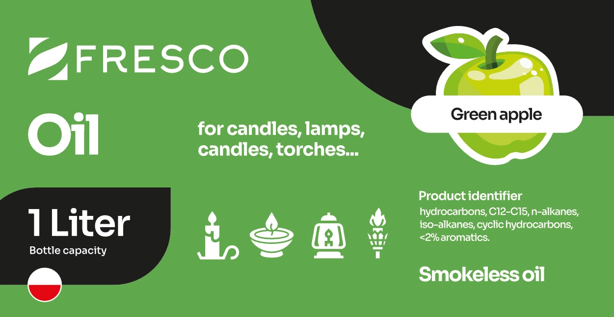 Olie til lamper, fakler og stearinlys med en behagelig æblearoma giver en stabil, lys og blid flamme uden uønsket røg (ved korrekt justering af vægen). Velegnet til havebelysning og til at gøre indretningen hyggeligere, ideel til dekorative lamper og klassiske olie-stearinlys.