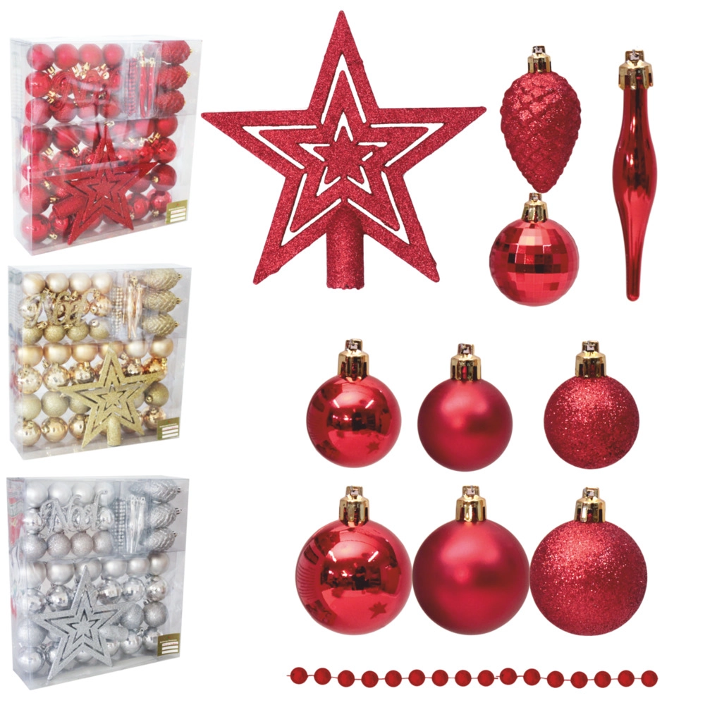 Elegant sæt med julepynt i traditionel rød til et klassisk pyntet træ. Indeholder forskellige typer pynt, perleguirlande og en stjernespids. Pynten er splintsikker, så den er sikker i hjem med børn og gør det let at skabe en harmonisk, festlig dekoration uden bekymringer.