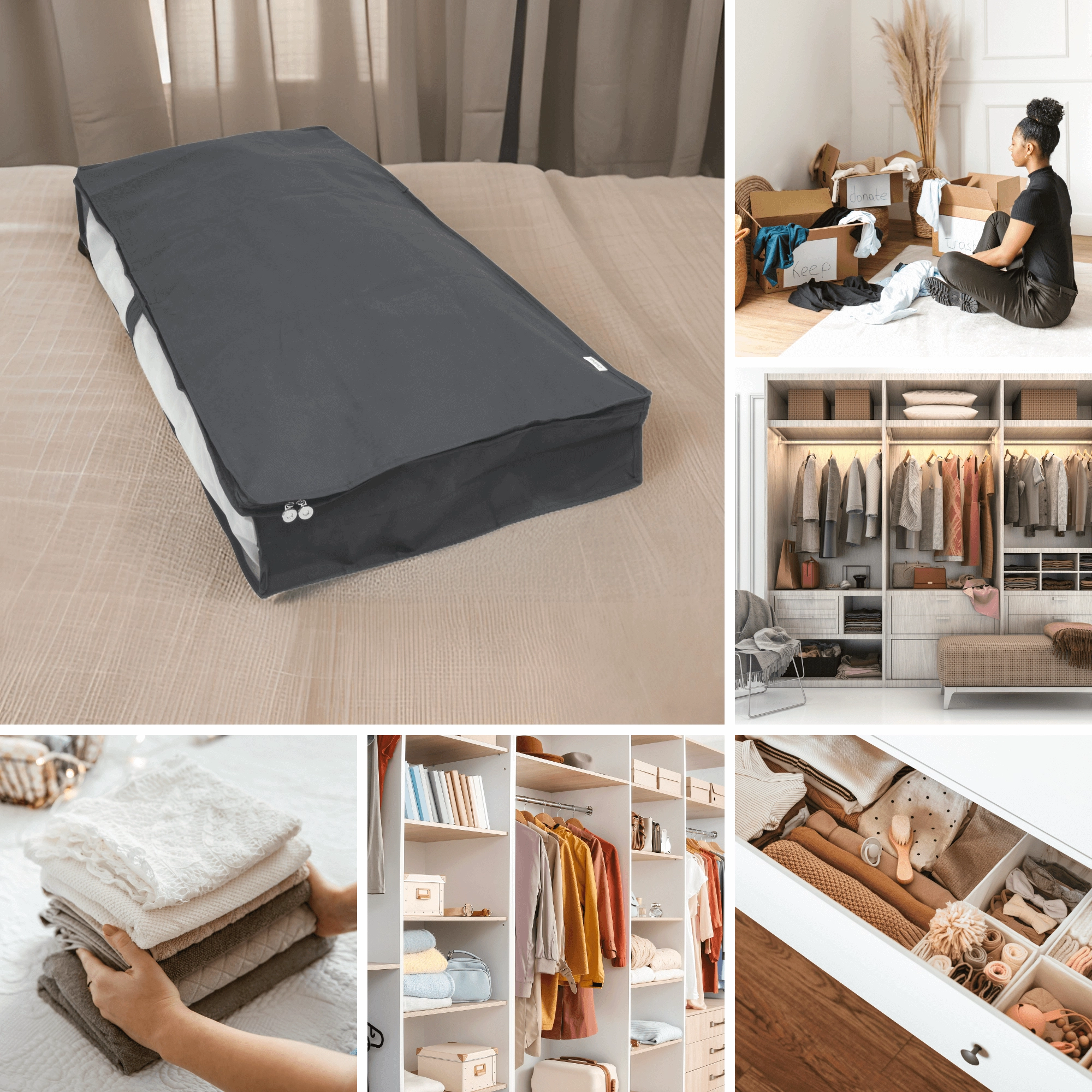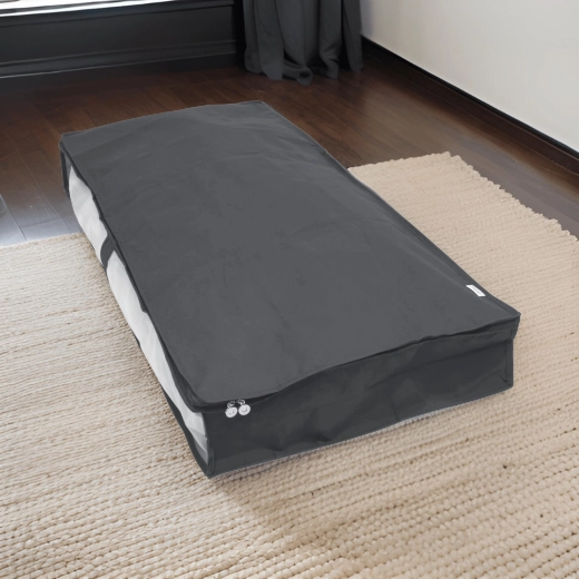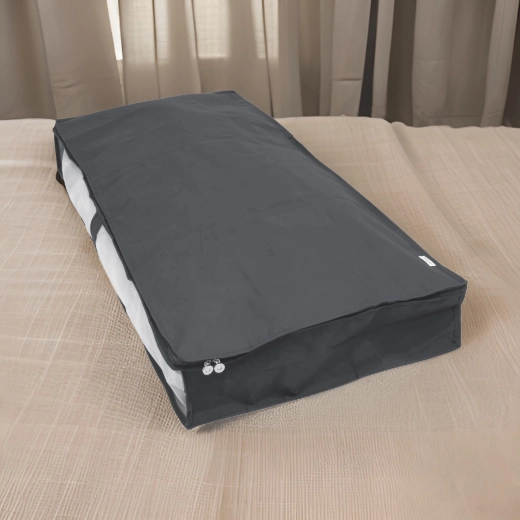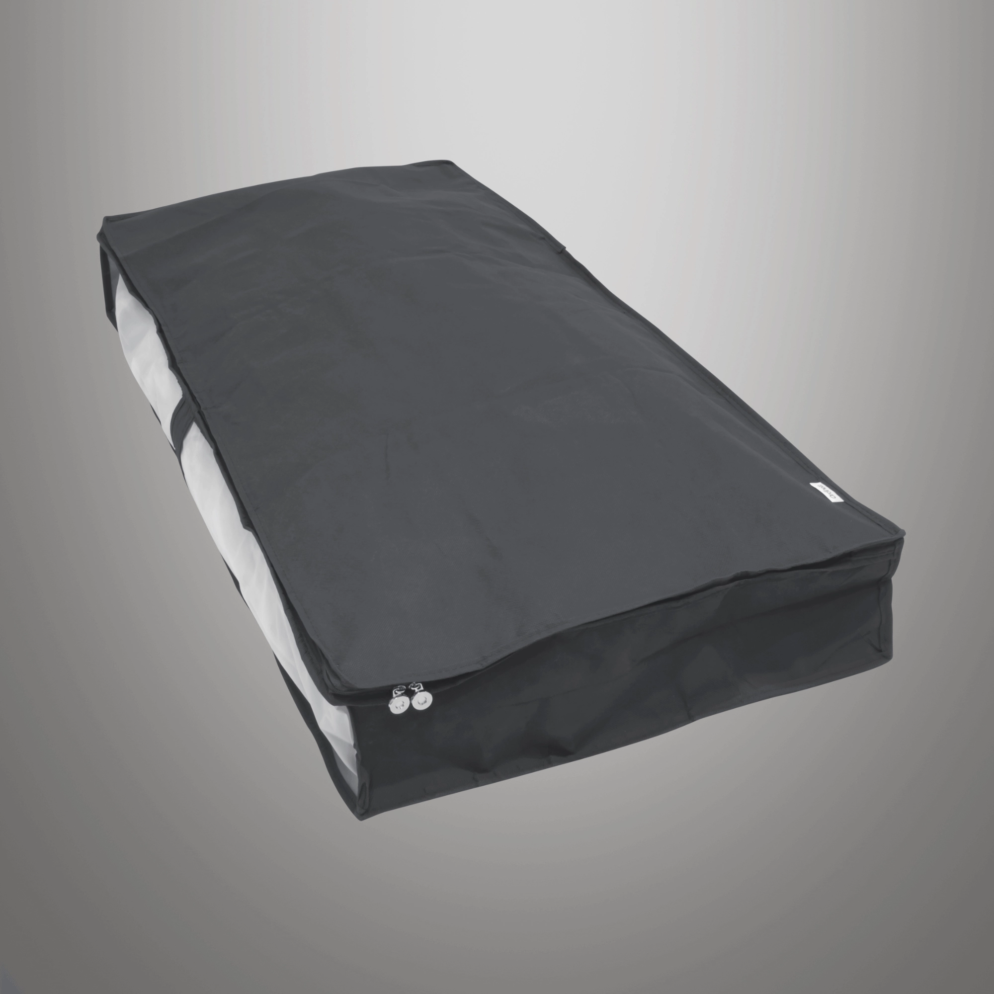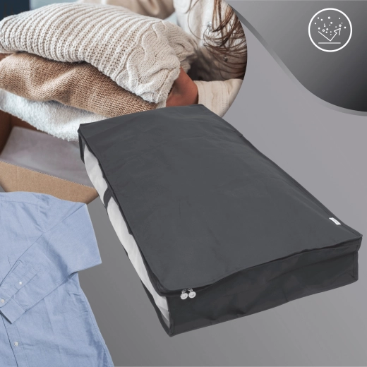 Hold orden i soveværelset og garderoben med en praktisk under-sengsorganizer i elegant grå. Den beskytter tøjet mod støv, har en gennemsigtig front for hurtigt overblik og en lynlås hele vejen rundt for nem adgang. Ideel til sæsonbetonet tøj, sengetøj og tekstiler.