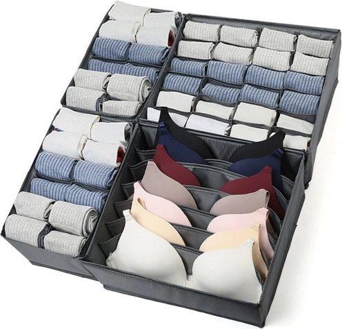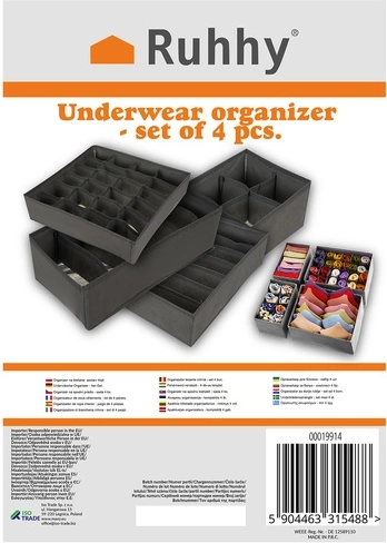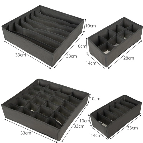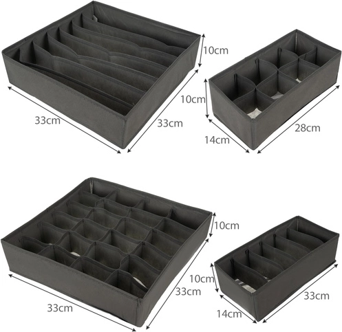 Få styr på skufferne med et praktisk sæt af 4 tekstilorganisatorer i stilfuld grå. Forskellige størrelser og antal rum gør det nemt at opbevare strømper, undertøj, bh’er og slips overskueligt. Den lette sammenklappelige konstruktion, forstærkede sider og åndbart materiale sikrer lang levetid og renhed uden fugt.