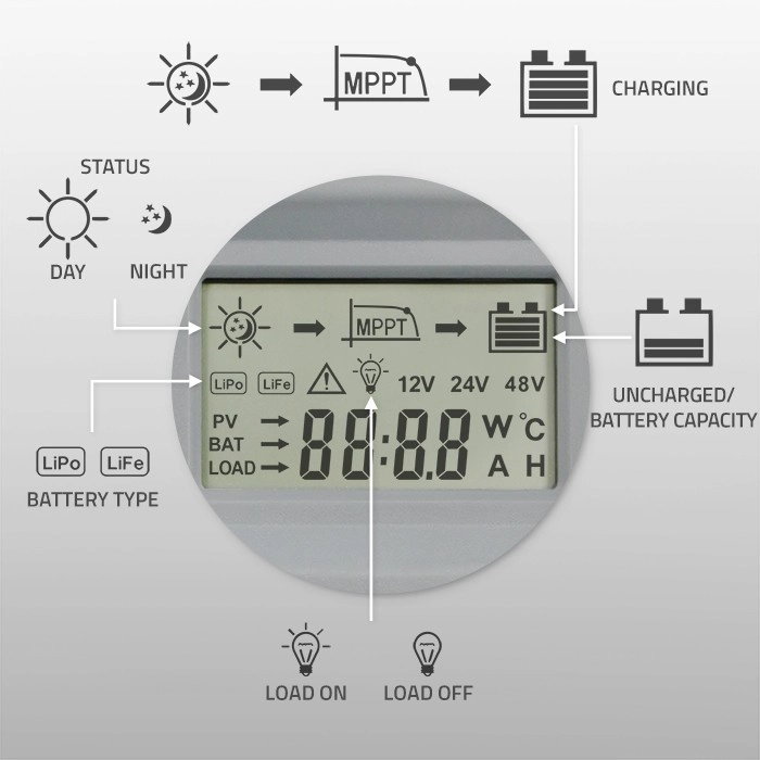Den integrerede LCD-skærm med overskuelig menu gør konfiguration, overvågning af driftsværdier og hurtig fejlfinding nem. Bluetooth og den mobile app muliggør fjernmonitorering i realtid, inklusive øjeblikkelige fejlmeddelelser og alarmer. Den eksterne temperatursensor optimerer opladningen og beskytter batteriet mod overophedning og overlading, hvilket forlænger dets levetid.