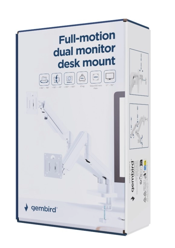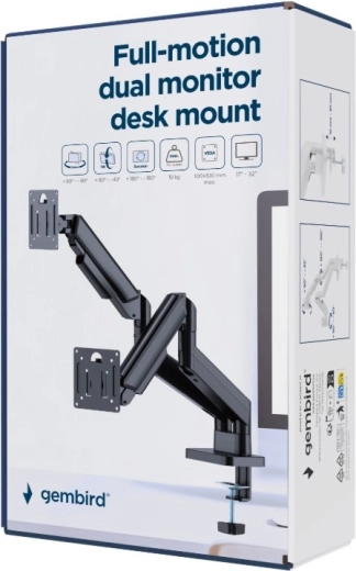 Forbedr ergonomien og ordenen på dit arbejdsbord. Den dobbelte arm gør det nemt at indstille begge skærme med én hånd – i højden takket være gasfjedre, til siderne, frem og tilbage, med mulighed for tilt og 360° rotation til arbejde i både landskab og portræt. Kompatibilitet med næsten enhver LCD-skærm 17–32" og standarden VESA 75×75 / 100×100 sikrer nem installation.