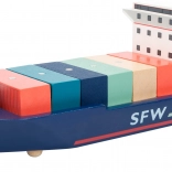 Det blå skib med farvede containere og to slæbebåde forbundet med en snor giver realistisk leg med søtransport.