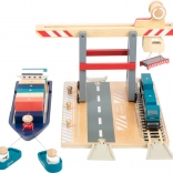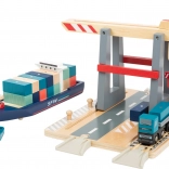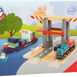 Denne gennemtænkte havnebyggekasse giver børn realistisk logistikleg: Skibet med to slæbebåde er klar til afgang, mens kranen omlader farvede containere ved hjælp af integrerede magneter. Robuste trådele og glidende funktionsdele styrker finmotorik, fantasi og tålmodighed.