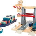 Kranen med magnet løfter og flytter let containere – børn træner koordinationen og oplever autentisk havnearbejde.