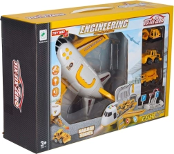 Sættet indeholder tre gule byggemaskiner – gravemaskine med bevægelig arm, betonblander og bulldozer – plus 7 trafikskilte. Alt passer ind i flyet. Legetøjet har aftagelige vinger for at spare plads og et håndtag for nem transport.