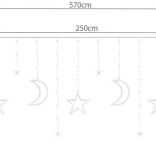 Specielle LED-dioder forbruger betydeligt mindre energi og udstråler ikke varme, hvilket gør dem energibesparende med en levetid på op til 35.000 timer. Den samlede længde af gardinet er 570 cm, med en variabel længde af hængende strenge 105/80/45 cm. Produktets vægt er 0,55 kg (inklusive emballage 0,62 kg), hvilket gør det let og nemt at montere.