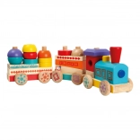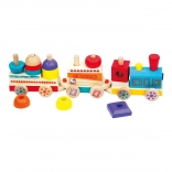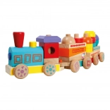 Den farvestrålende trætog i “MAXI”-størrelse er både en træk-legetøj og en byggesæt. Ved at stable vogne af klodser i forskellige former kan de mindste udvikle fantasi og motoriske færdigheder. Fremstillet af robust massivt træ. Hovedfunktioner: 3 undervogne og 18 forskellige klodser, MAXI-størrelse, holdbar udførelse i træ