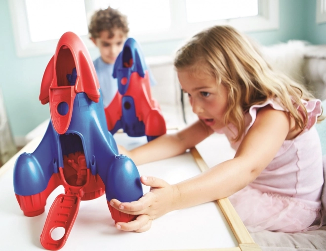 Tag på rummission med legetøjet GREEN TOYS – en blå raket lavet af genanvendt plast fra mælkeflasker. Sikker for børn, fri for PVC, BPA og ftalater, med aftagelig cockpit, åbne-/vipdøre og to astronauter til kreativ leg derhjemme, i sandkassen og ved vandet.