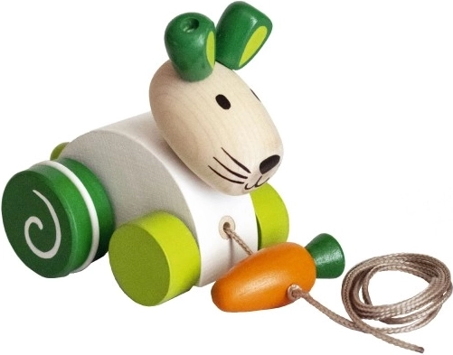 Denne træktrækanin i træ motiverer børn til at gå og bevæge sig aktivt. Takket være den glatte finish og robuste konstruktion er legetøjet sikkert og behageligt at holde om. Guleroden, der er fastgjort til en snor, giver en sjov detalje og stimulerer barnets fantasi.
