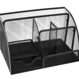 Hold styr på skrivebordet med en kompakt og holdbar skrivebordsorganizer af metalnet (mesh) i elegant sort. Den tilbyder 6 rum, en praktisk udtræksskuffe og en smart inddeling til blyanter, overstregningstuscher, selvklæbende sedler, clips og saks – ideel til kontoret, hjemmekontoret og studier.
