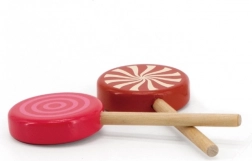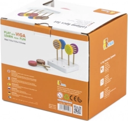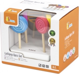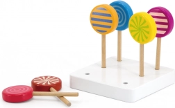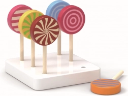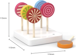 Sættet med 6 slikkepinde er monteret på en hvid træbase, hvilket giver et flot udtryk. Slikkepindene vil være en vidunderlig tilføjelse til børnenes butik og vil helt sikkert glæde alle slikelskere!