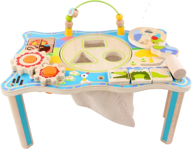 Træbordet med junglemotiver forener leg og læring og styrker finmotorik, hånd–øje-koordination og logisk tænkning. Børn kan dreje tandhjul, flytte perler på banen, træne styrke og fokus med bankesættet og øve formgenkendelse med formsortereren. I midten er der en linnedpose til fangede fisk og spillebrikker, som holder legeområdet ryddeligt.