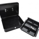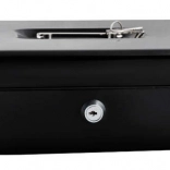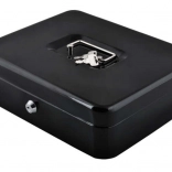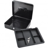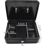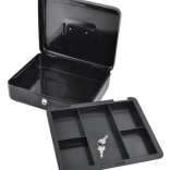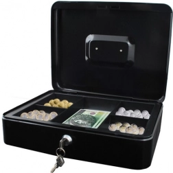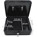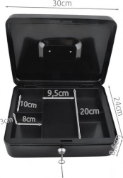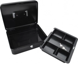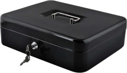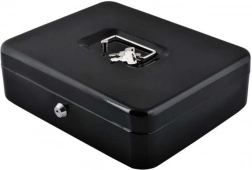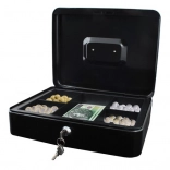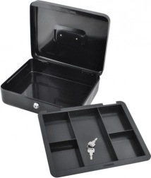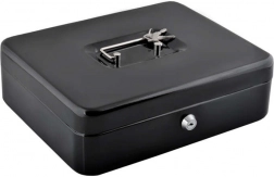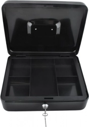 Praktisk kontantboks i stor størrelse beskytter pålideligt kontanter, dokumenter og små værdigenstande. Takket være nøglelås, robust stålkonstruktion, indvendig indsats med rum og nedfældeligt håndtag er den ideel til hjemmet, kontoret og salgsarrangementer.