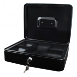 Denne store metal-kontantboks i elegant sort forener sikkerhed, overblik og holdbarhed. Den lakerede stålkappe og de solide indvendige hængsler beskytter indholdet mod skader og uautoriseret adgang, mens nøglelåsen (2 nøgler medfølger) giver tryg låsning.